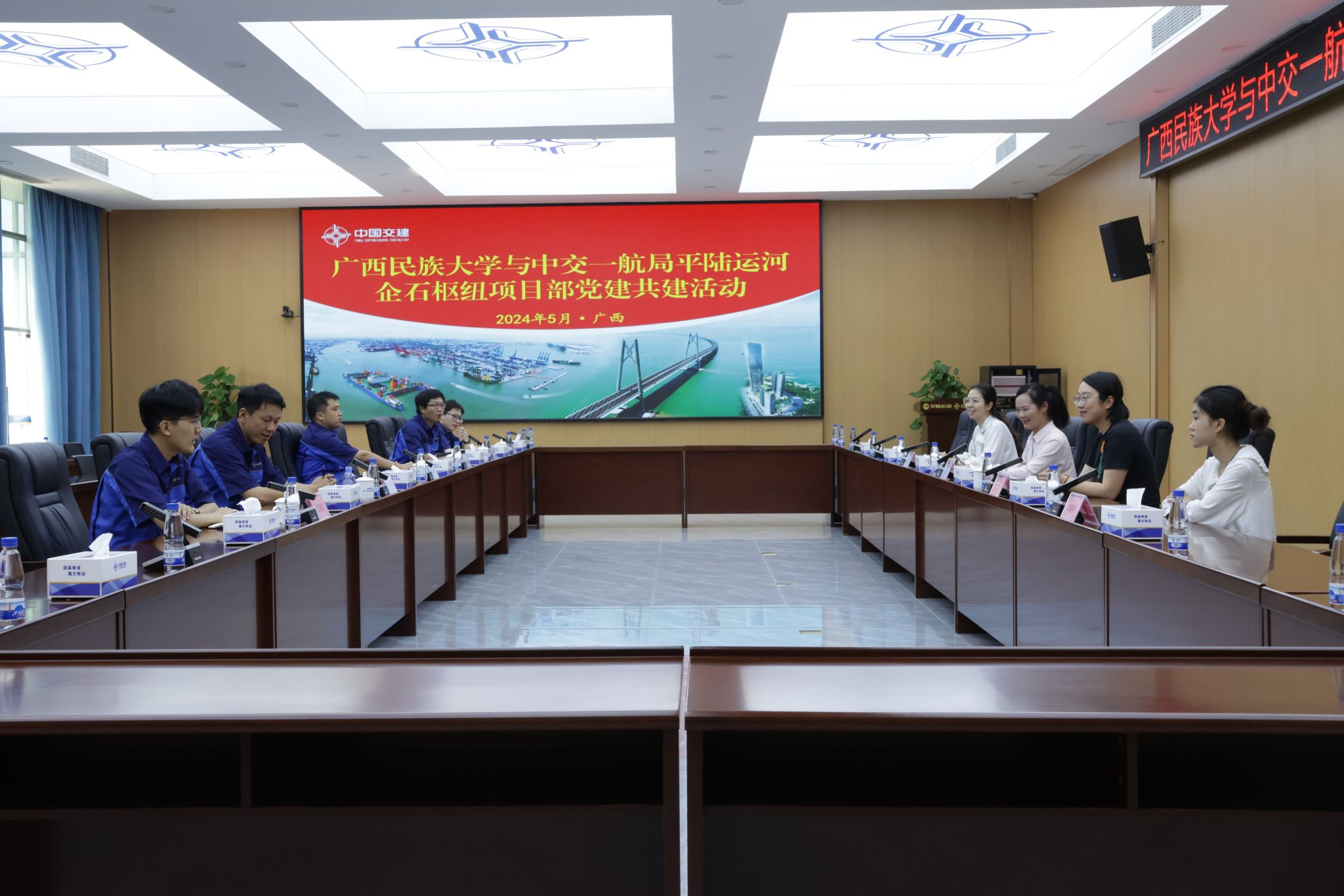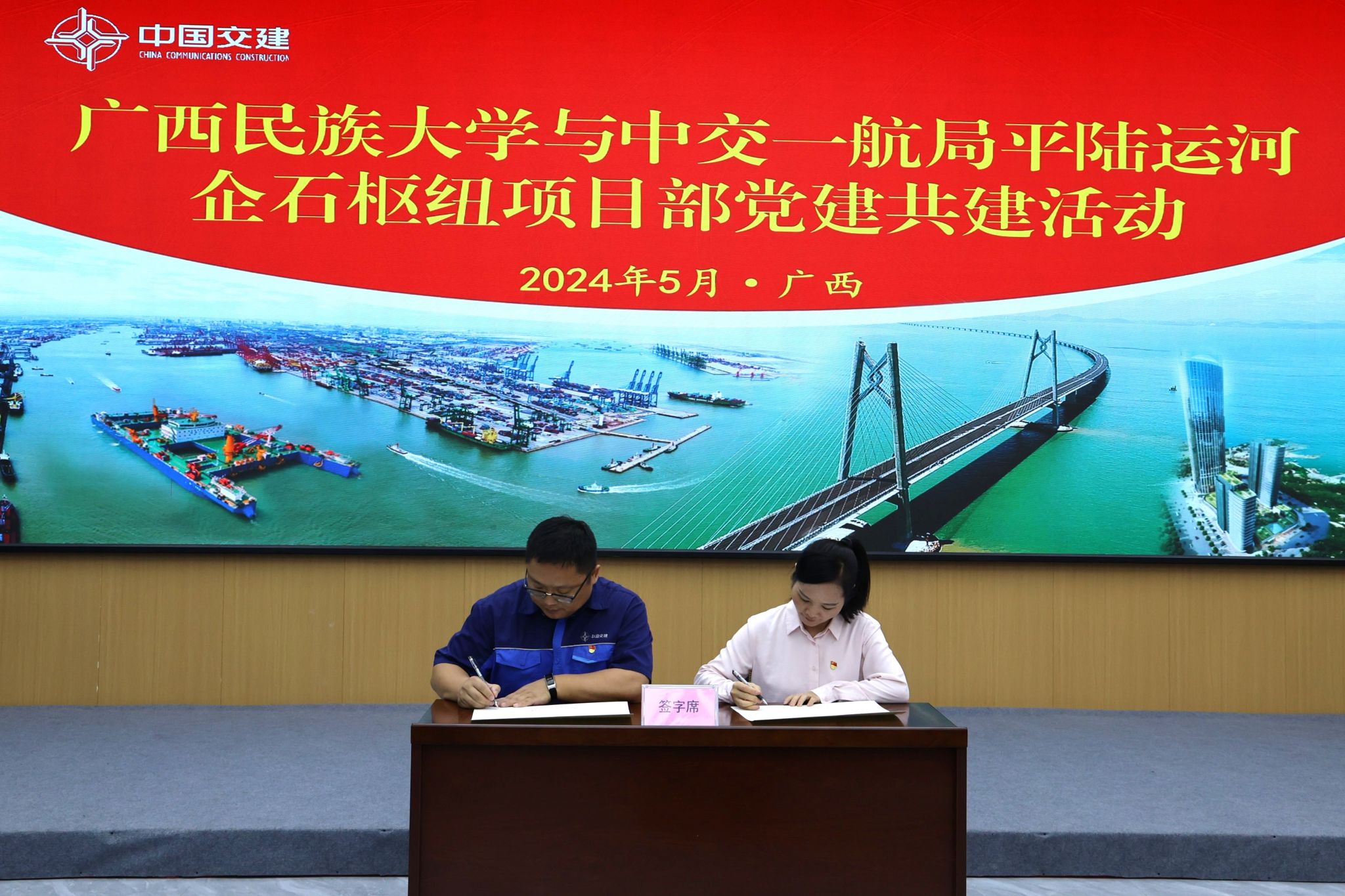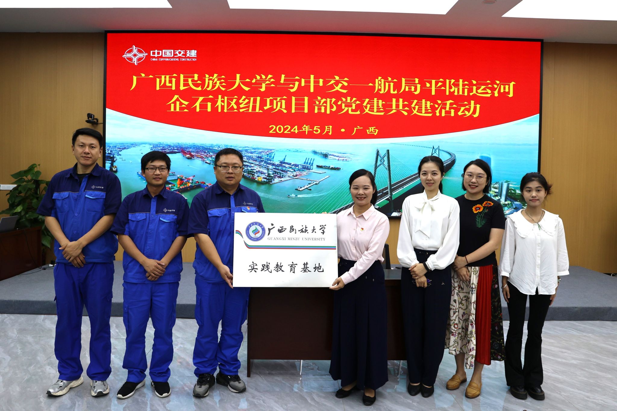 5月24日,我院与中交一航局平陆运河企石枢纽项目部签署“广西民族大学实践教育基地”协议。我院党委副书记覃慧敏与中交一航局平陆运河企石枢纽项目部党支部书记邵峰共同出席签约授牌仪式。仪式由项目部党支部副书记李文文主持,企石枢纽项目部副总工邳建亚、综合办公室主任李明、人事主管王玉峰、党群干事郑大治及我院师生代表参加了本次揭牌仪式并座谈。