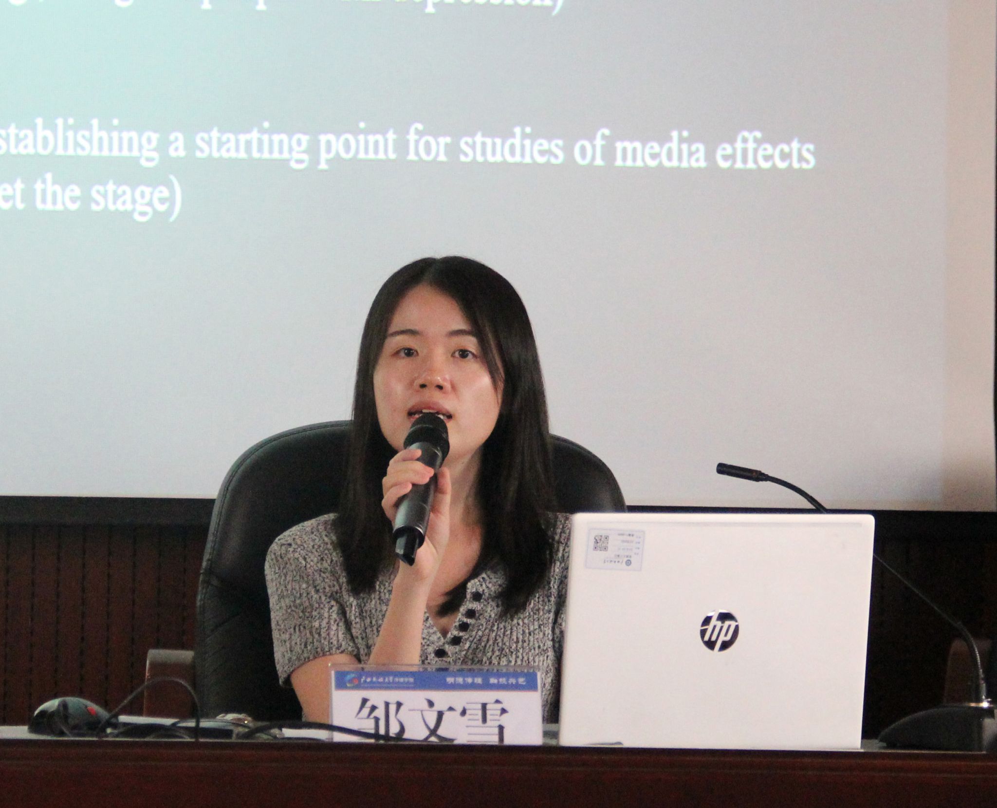 在交流讨论环节,邹文雪分享了做好研究选题的方法,回答了同学们在期刊投稿中遇到的问题,并对2023级新闻与传播专业研究生文星桥关于编码源的问题作出了详细解答。