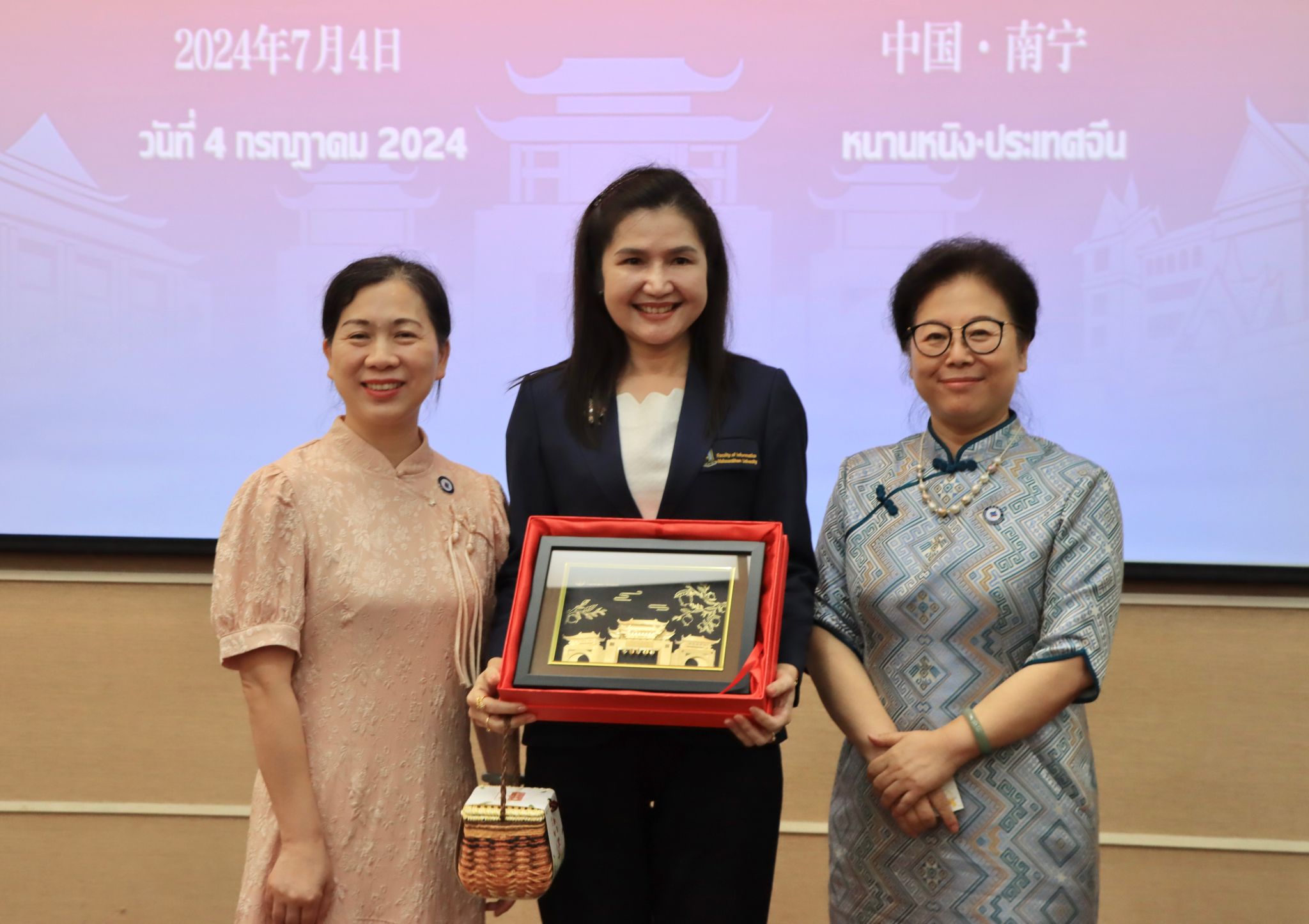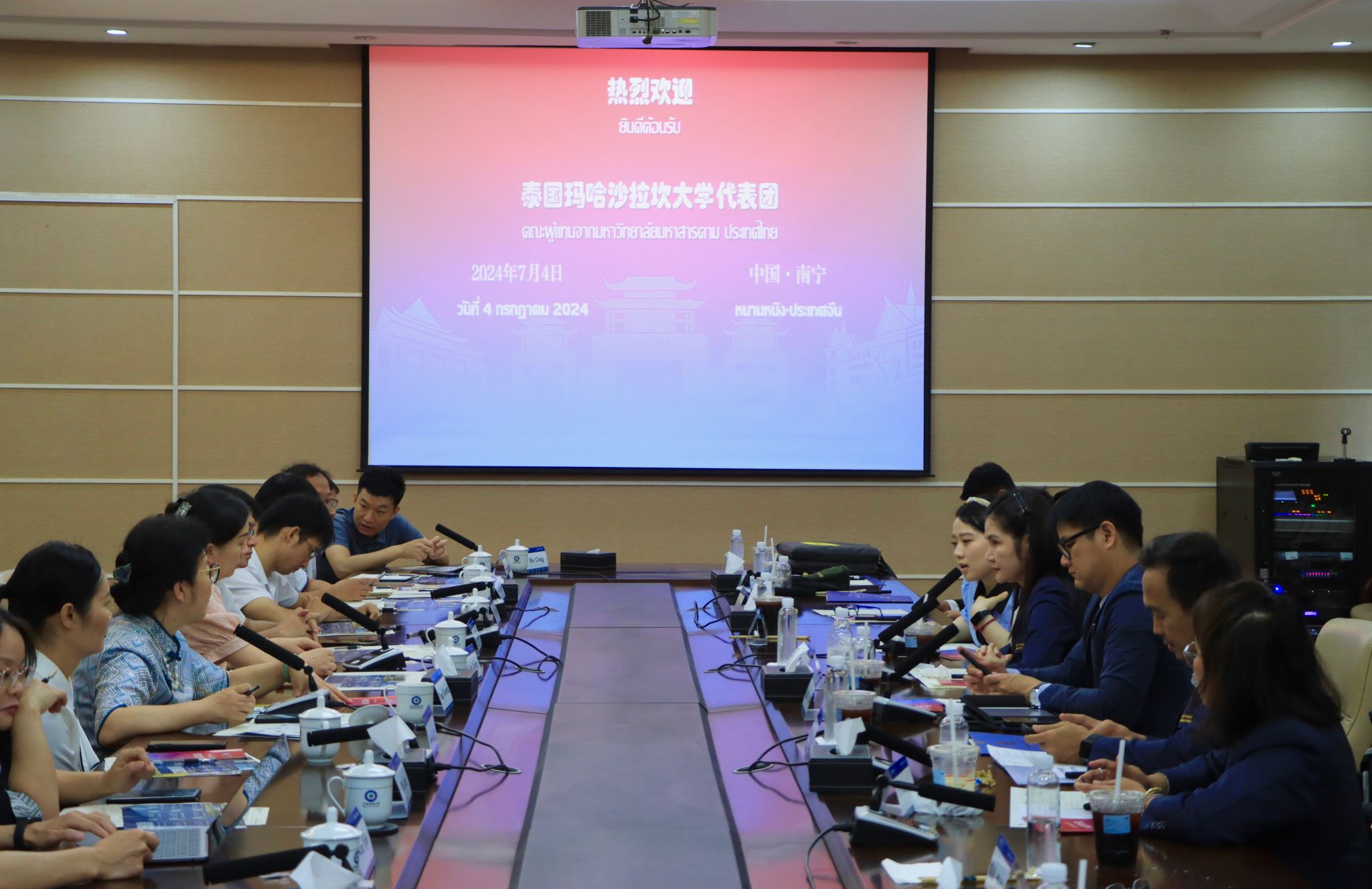 7月4日上午,泰国玛哈沙拉坎大学信息学院院长詹替玛·颇毗尼(JANTIMA POLPINIJ),学术资源中心(图书馆)主任、创意媒体博士专业教师拉达那措·天谋坤(RATANACHOTE THIENMONGKOL)等一行九人到访我校。我校bw必威西汉姆联院长杨学明、电子信息学院院长罗丽平等十四人参与双方的交流活动。本次交流既有“热茶与冰咖啡”的文化碰撞,还有跨校的宣传片观摩与跨国的交流合作,更有蕴含中泰历史文化的情谊互赠和两校友谊的历史追寻……