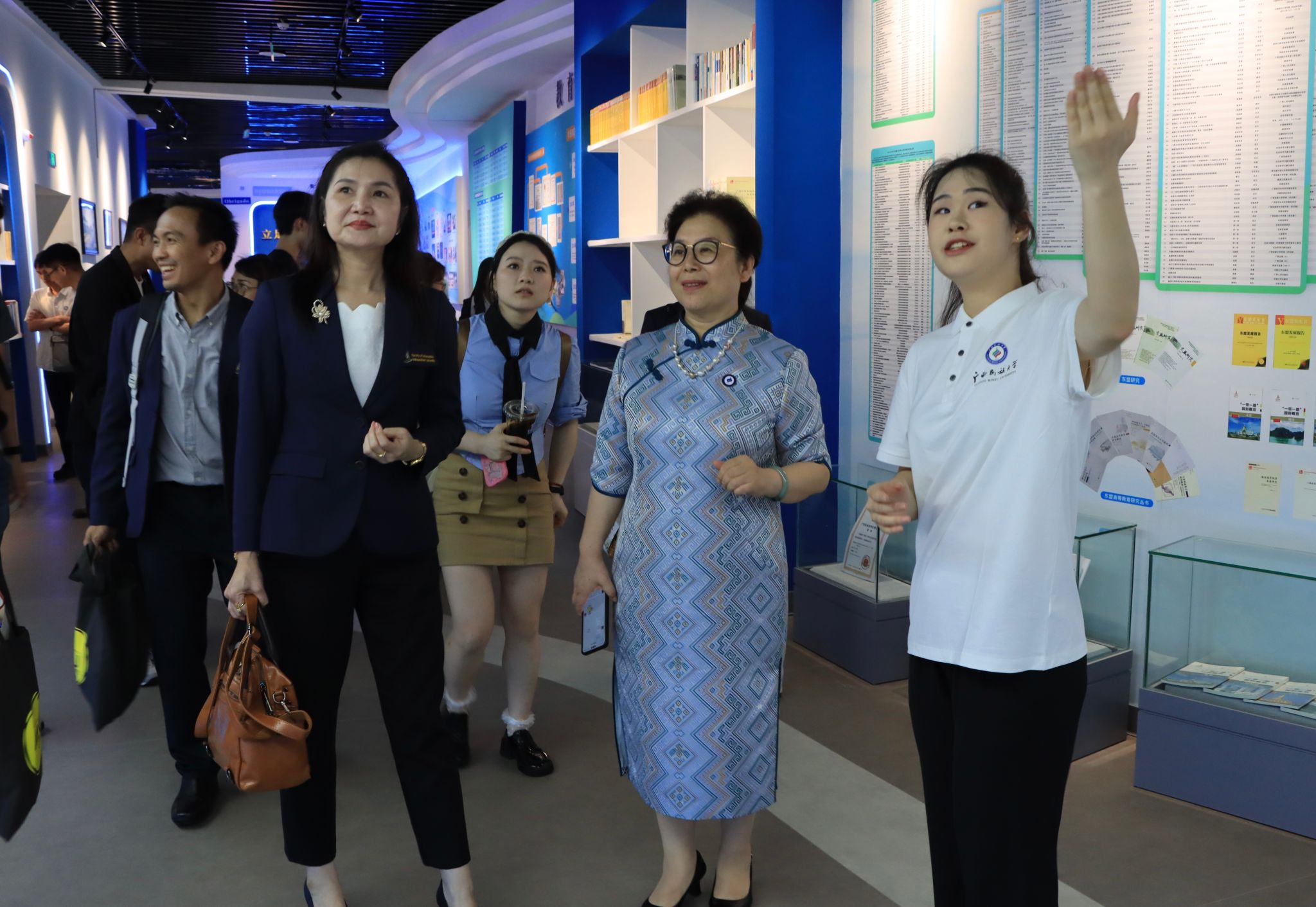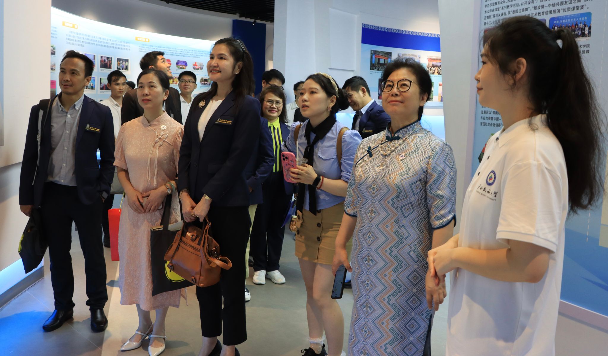 座谈会后,玛哈沙拉坎大学一行人到我校东盟文化交流中心参观。讲解员向他们介绍了我校与东盟各国教育交流与合作的历史,并阐述了我校与泰国在教育合作方面的渊源与发展。