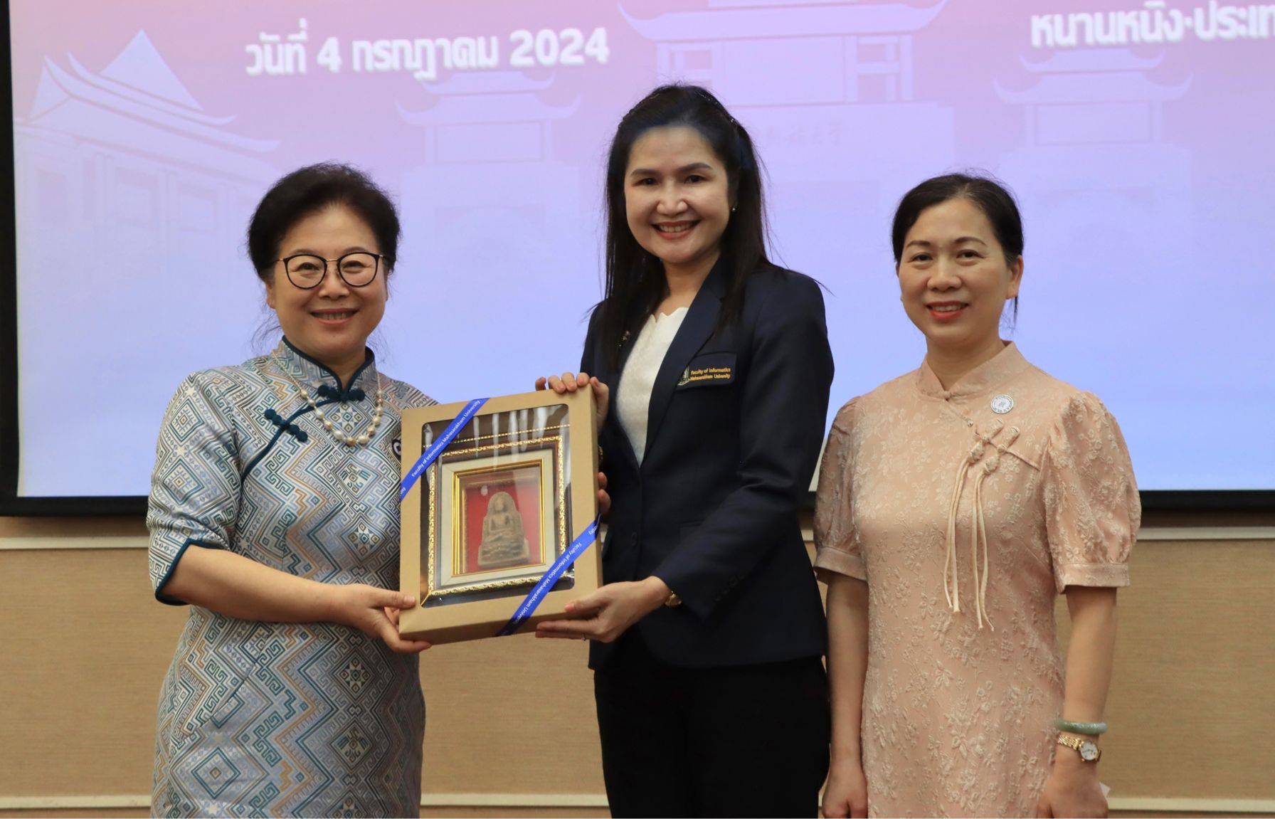 座谈会结束后,杨学明、罗丽平代表我校与玛哈沙拉坎大学詹替玛·颇毗尼互换礼物。詹替玛·颇毗尼赠予我校蕴含泰国佛教文化的佛像。我校赠予玛哈沙拉坎大学极具广西特色的梧州六堡茶和广西民族大学金箔画纪念品,希望用六堡茶的文化韵味和民族特色,让玛哈沙拉坎大学到访者深刻感受到广西的文化和中泰的“茶友情”。