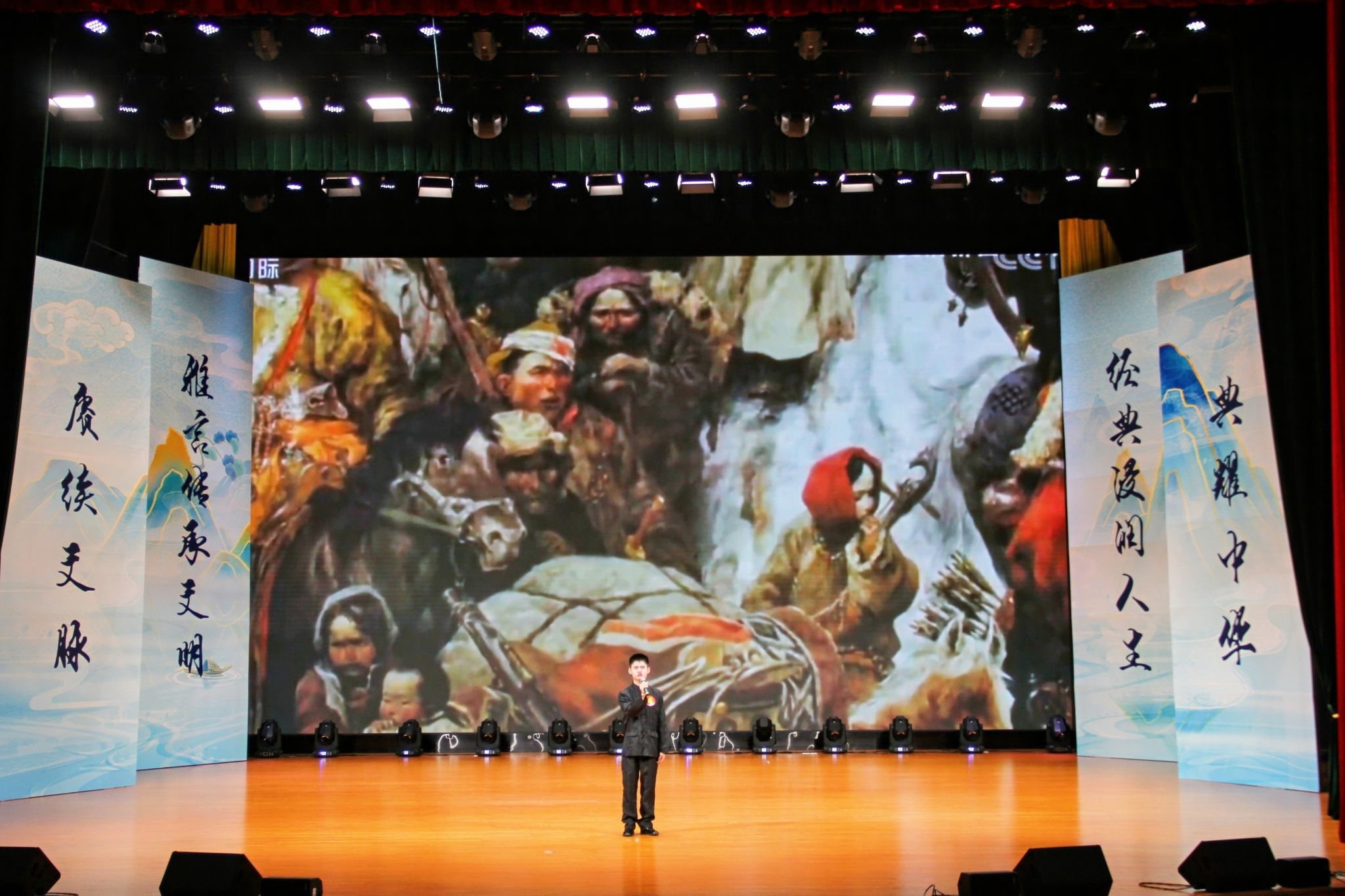 “公元1771年,从中国迁徙到伏尔加河下游生活了近两百年的蒙古土尔扈特部……”身着一袭黑色中山装的韦文宝紧闭着双眼,饱含情感地朗诵着他的比赛篇目《东归英雄》,通过铿锵的诵读表达蒙古土尔扈特部族在历史长河中坚韧不拔、勇往直前的精神。