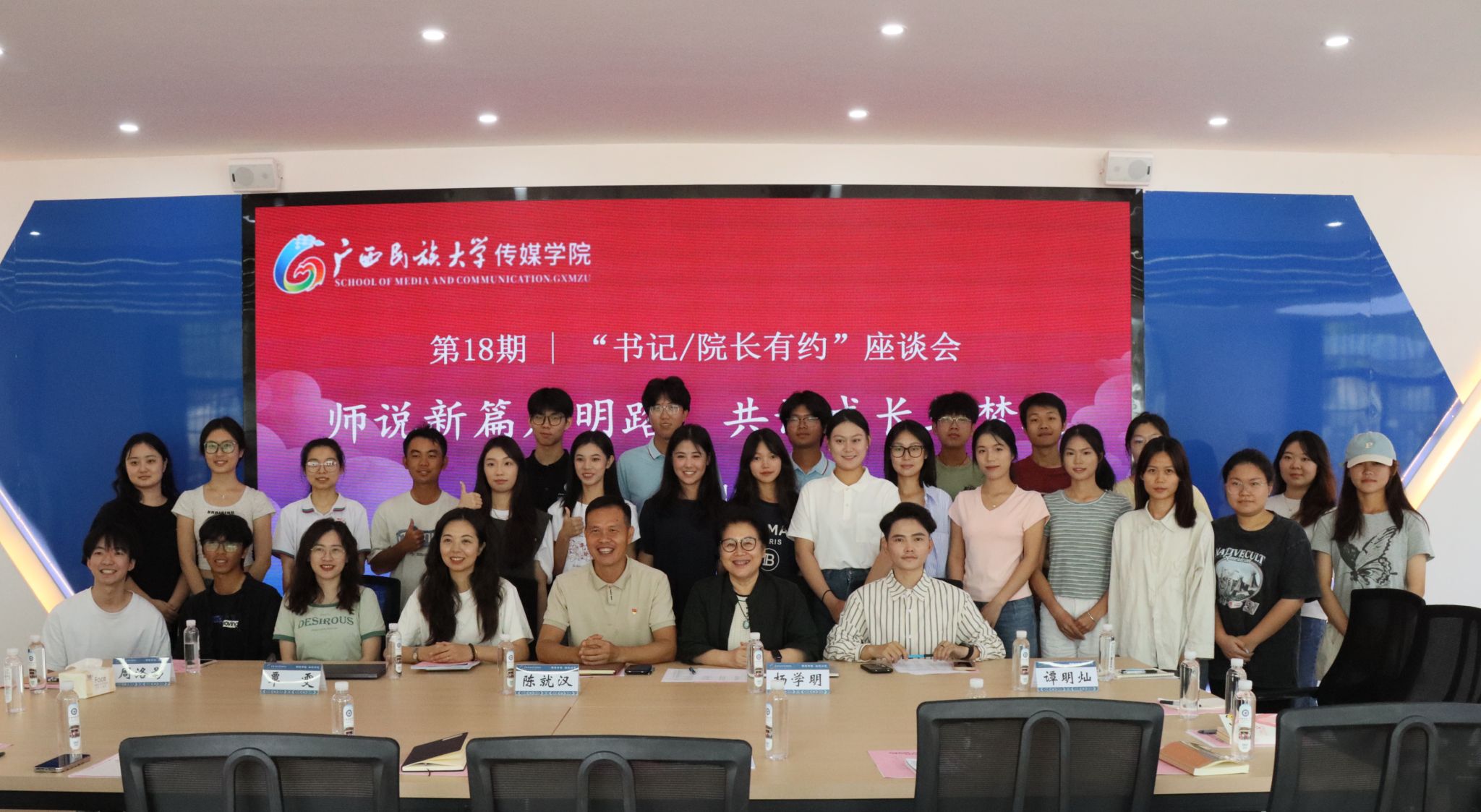 为深入了解2024级新生的学习和生活情况,面对面倾听学生心声,9月27日上午,我院在明德楼一楼大厅召开第18期“书记/院长有约”座谈会。学院党委书记陈就汉、院长杨学明、部分教师代表与学生代表座谈交流,座谈会由辅导员、兼职团委副书记谭明灿主持。