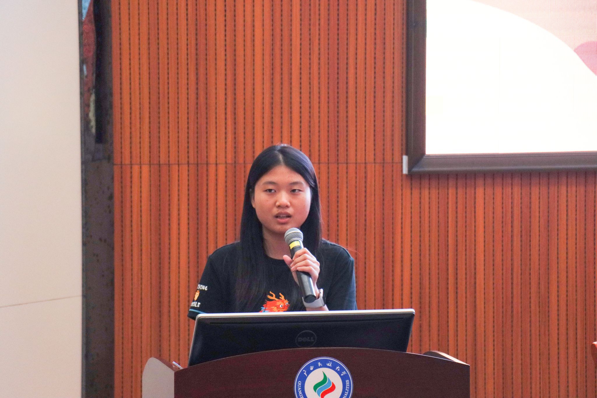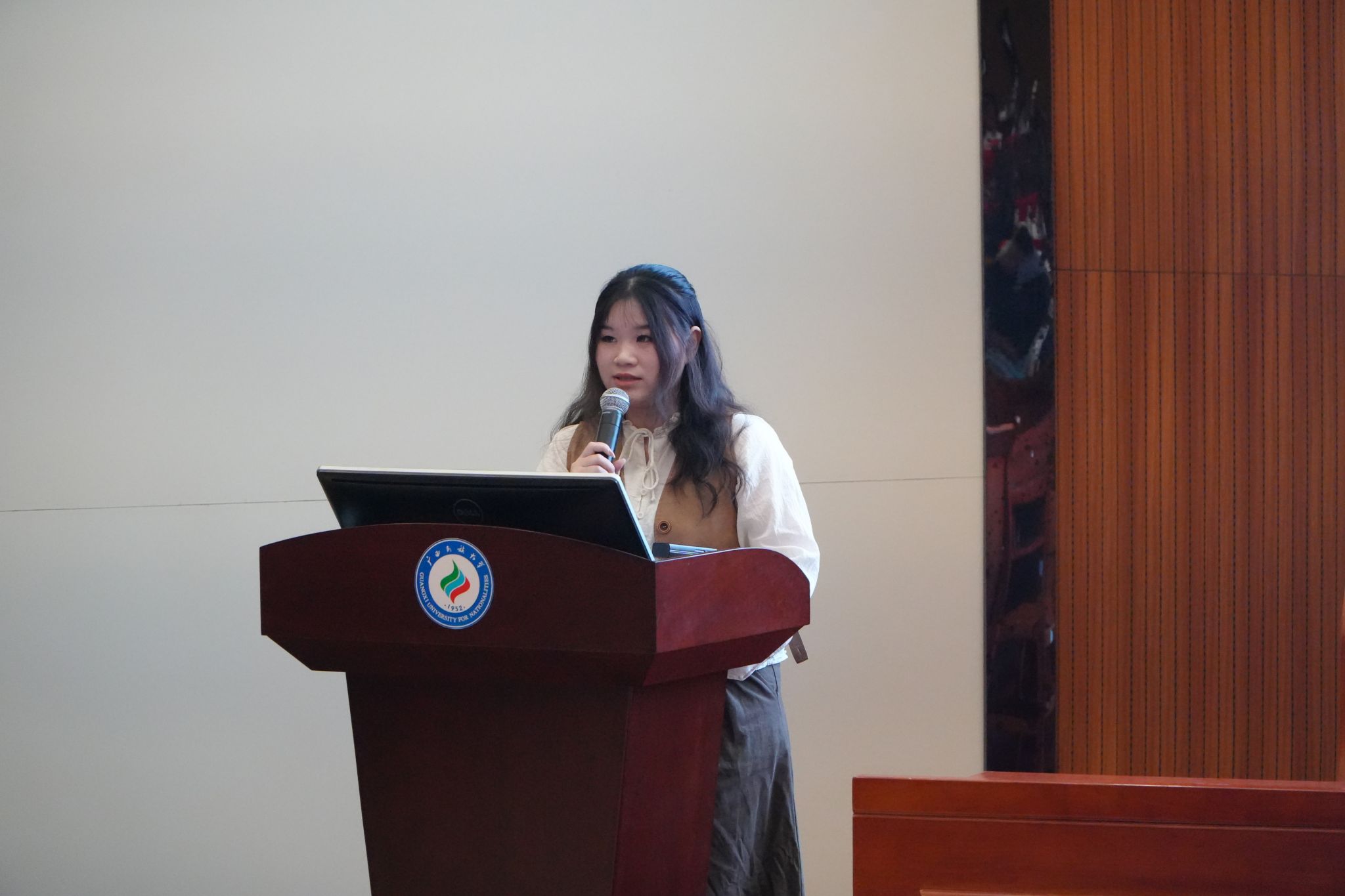 2023级新闻与传播专硕李心分享自己的实习过程与经验,介绍在实习期间遇到的种种,讲述自己在每个不同的实习平台所得的收获,她说:“在河池电视台,我见证了镜头前的瞬息万变,学会捕捉每一个动人的瞬间;在广西云,我领略了媒体的无限可能,激发了我的创新思维;在新华社,我更是得到了前所未有的锻炼和成长,我深刻感受到了新闻的力量,也明白了传媒人的坚守与担当。”