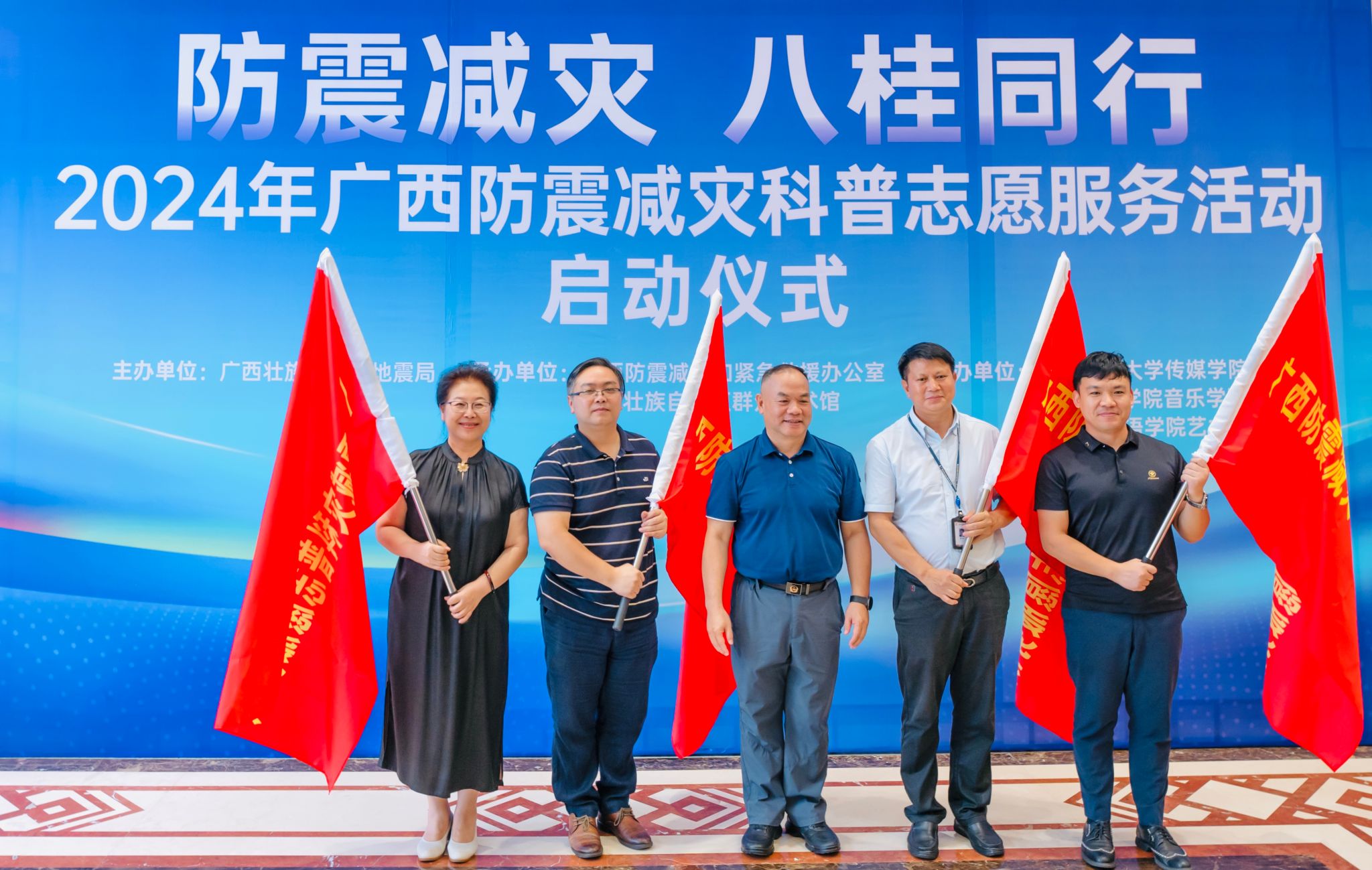 (广西地震局党组书记、局长黄国华为2024年广西防震减灾科普志愿服务活动单位授旗)