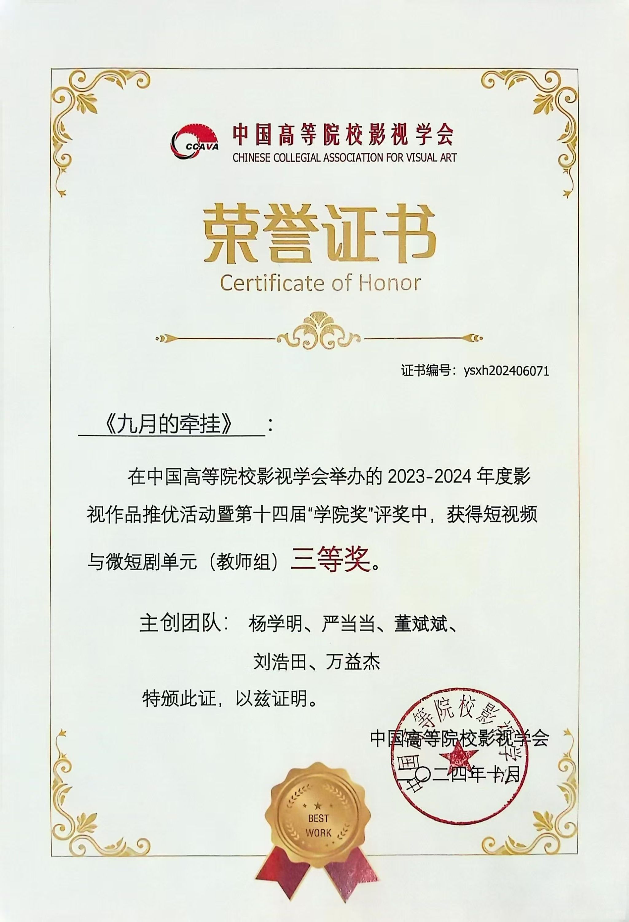 10月26日,以“新时代 新使命:中国影视与中华民族现代文明建设”为主题的中国高等院校影视学会第二十四届年会暨第十七届中国影视学术论坛在辽宁大学隆重举行。当晚,中国高校影视学会举行2023-2024年度影视作品推优活动暨第十四届“学院奖”发布仪式,bw必威西汉姆联师生的作品《九月的牵挂》荣获短视频与微短剧单元三等奖。