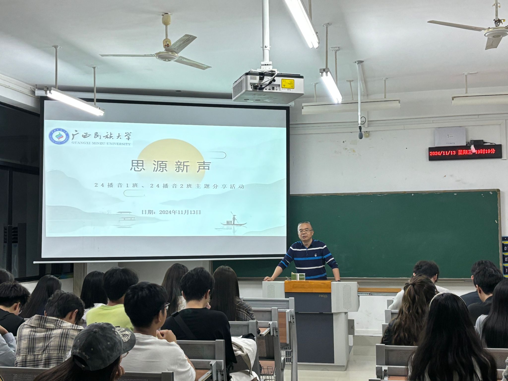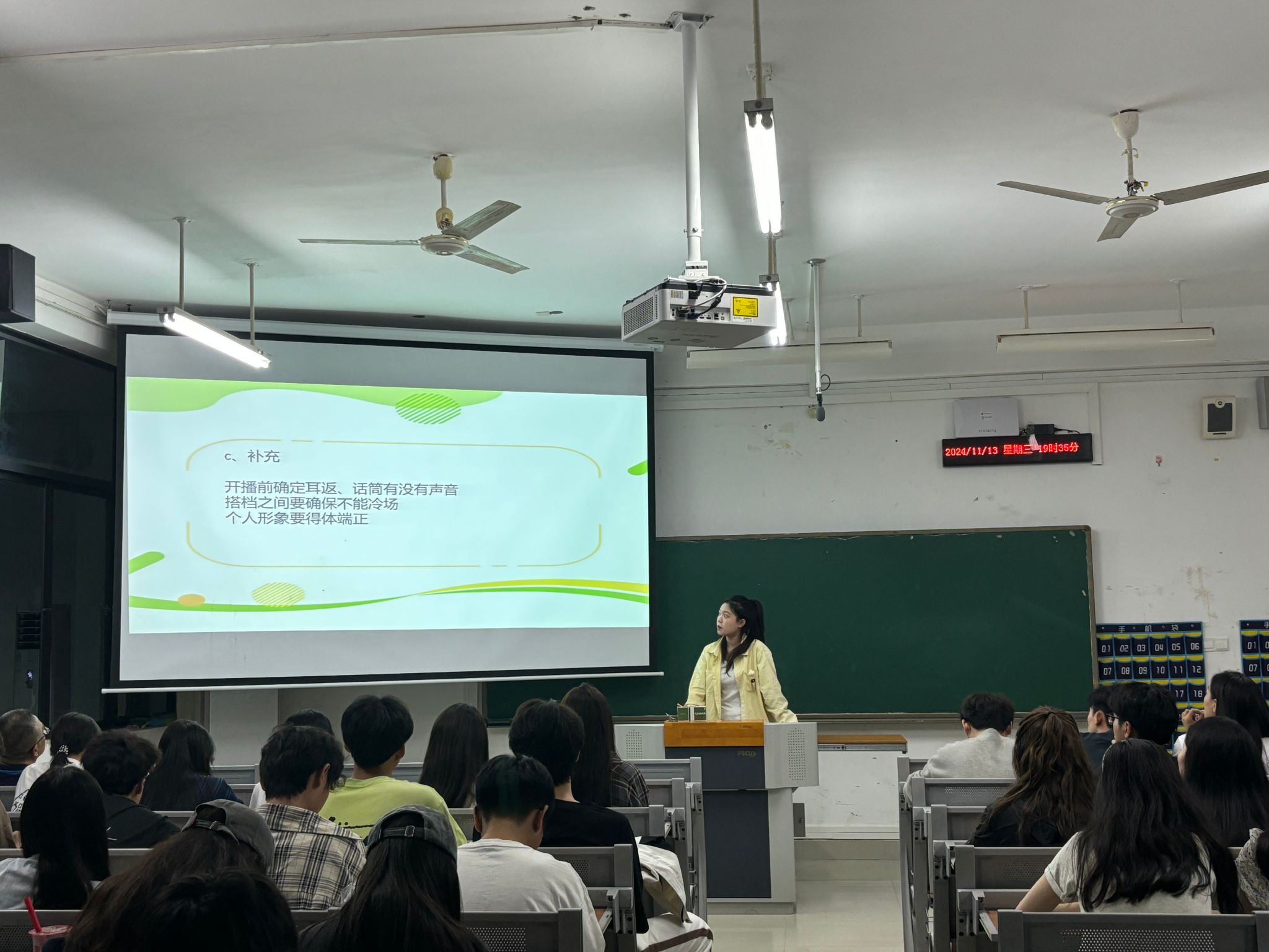 11月13日晚,我院2024级播音与主持艺术专业新生第四期“思源新声”主题经验分享会在明德楼315教室举办。本次活动由播音与主持艺术专业负责人、2024级播音专业班主任黄春平老师主持,邀请了2023级播音与主持艺术专业的学生罗文嘉、罗楠、姜宇翔、柯琦、魏旭娇、孙煜翔、武煜堃和覃婷婷担任经验分享人。