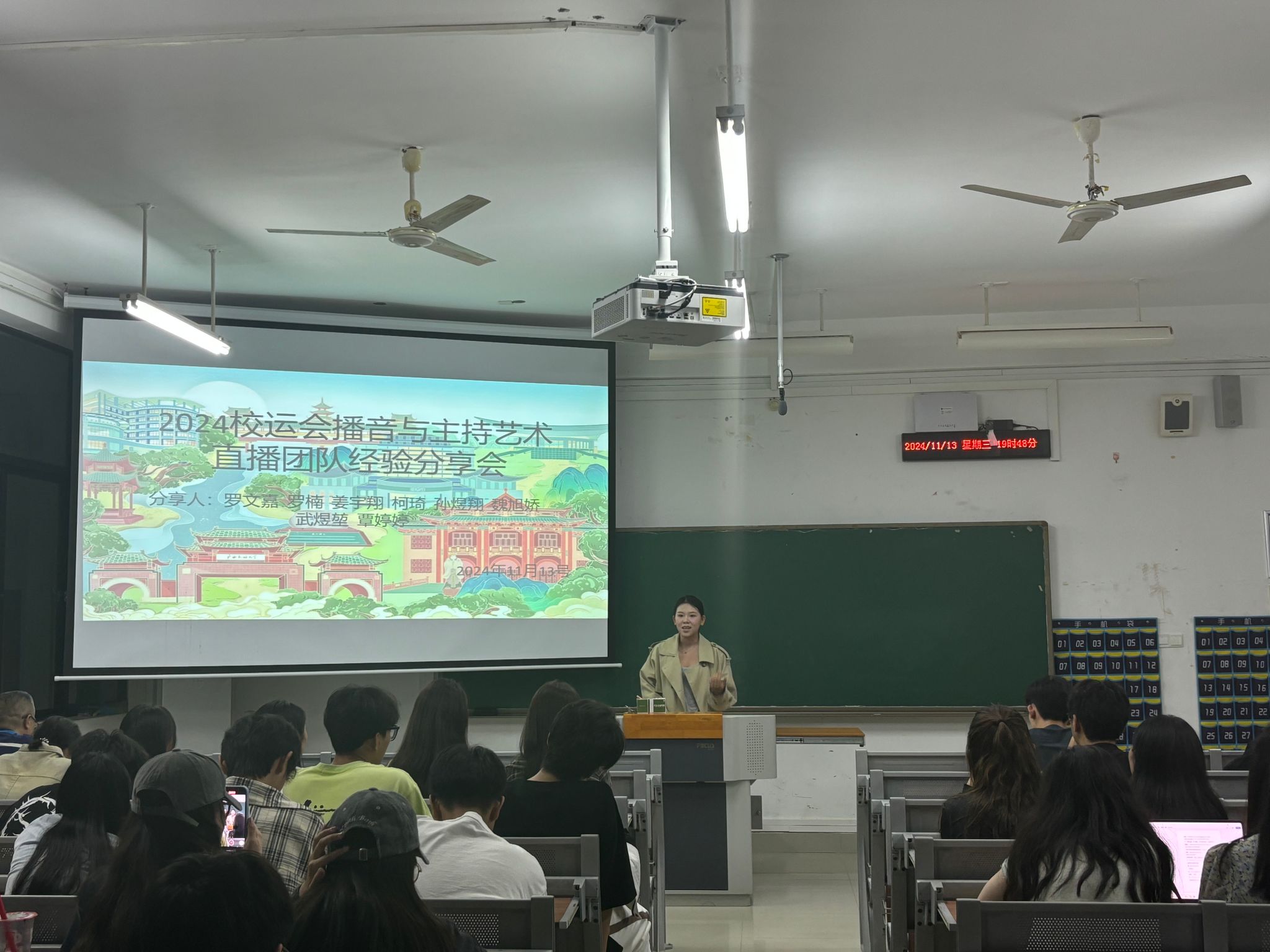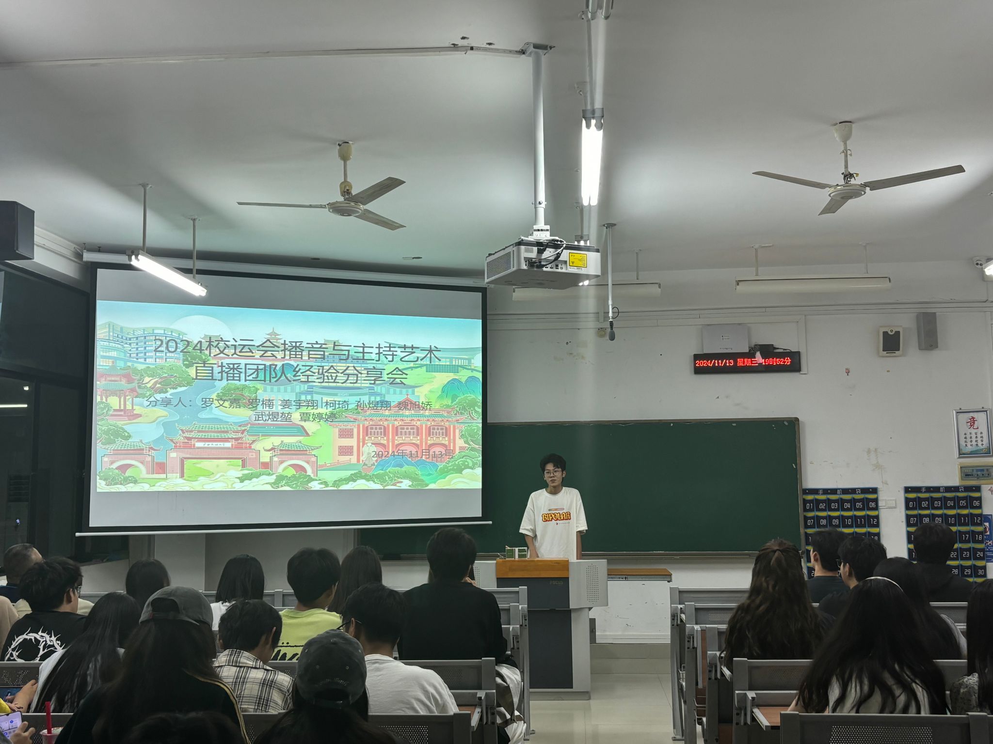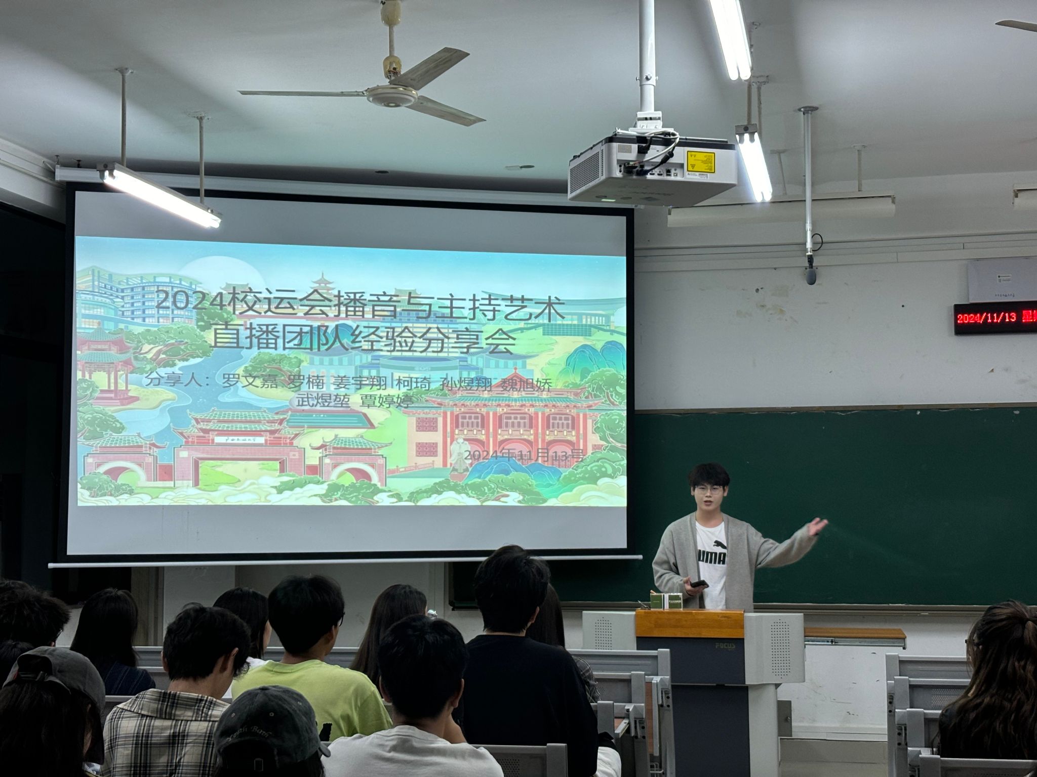 本次分享会聚焦于我校校运会直播活动,旨在交流实践经验。罗文嘉同学分享了筹备阶段的准备工作,包括了解运动会项目及规则、确定外采对象与初步规划、与导播前期沟通以及模拟赛事解说的学习。罗楠同学则分享了在校运会期间直播间内的解说经验,讲述了如何应对突发状况及解决办法。姜宇翔和柯琦两位同学承担了采访任务,尽管是首次在运动会中进行采访,但他们依然出色地完成了任务。他们向2024级的学弟学妹们讲述了自己在校运会采访过程中遇到的各种挑战及应对策略,并鼓励大家勇于尝试,抓住每一个机会锻炼自己。魏旭娇和孙煜翔两位同学在校运会开、闭幕式中承担了直播任务。他们强调了解说员的激情与专业对于观众理解比赛的重要性,并指出与镜头后团队的默契配合是使直播生动的关键因素。面对校运会现场复杂多变的情况,他们分享了冷静且迅速的应对策略,以确保直播过程顺畅无阻。武煜堃和覃婷婷两位同学在校运会开、闭幕式中担任主持人,他们鼓励大家努力提升临场应变能力,不断夯实基础,提高专业素养,以便在面对突发状况时能够更加从容应对。