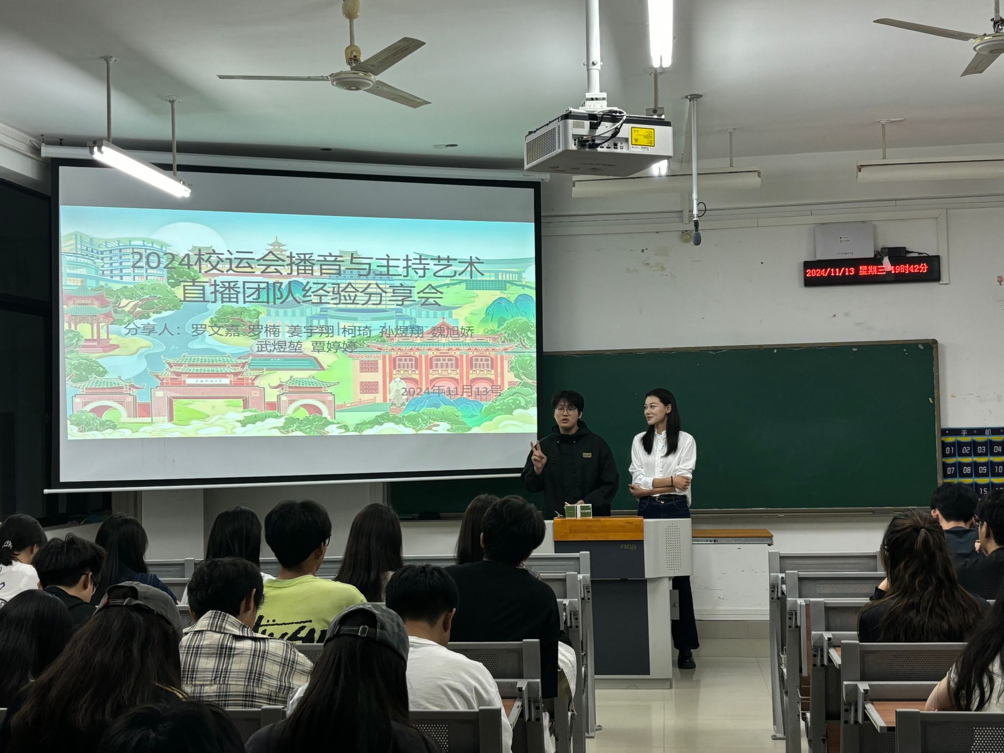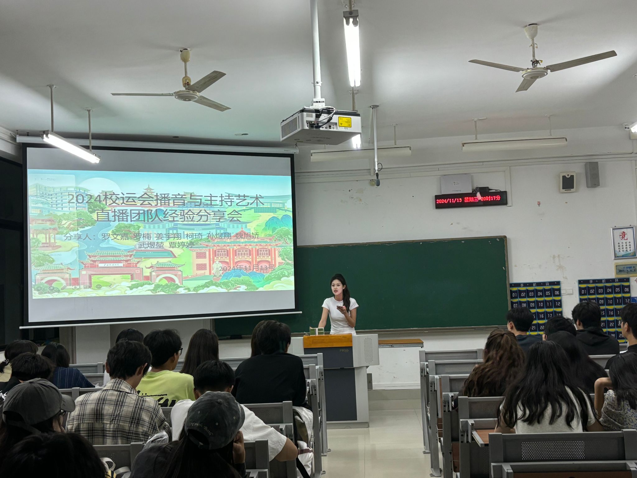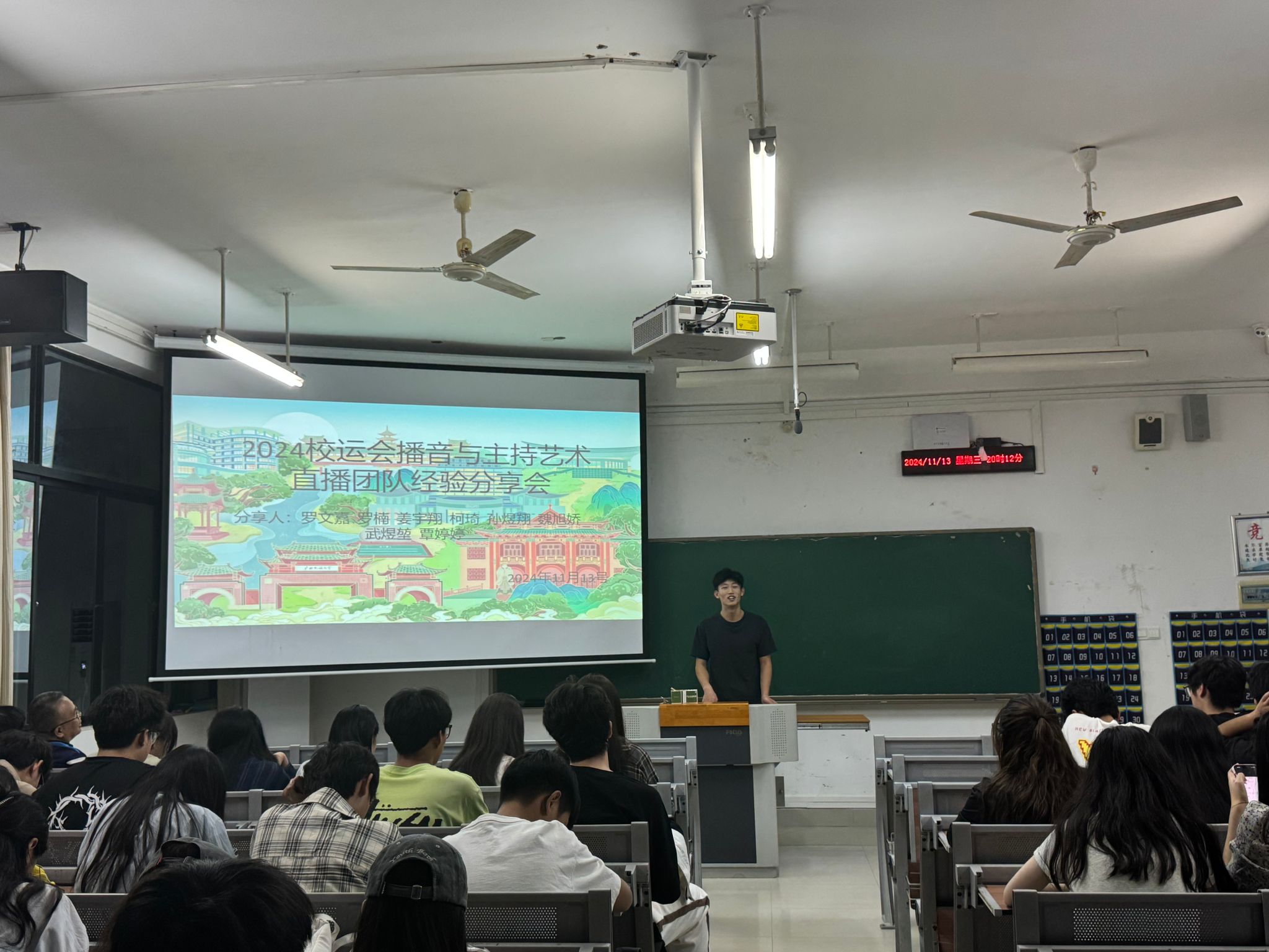 本次分享会聚焦于我校校运会直播活动,旨在交流实践经验。罗文嘉同学分享了筹备阶段的准备工作,包括了解运动会项目及规则、确定外采对象与初步规划、与导播前期沟通以及模拟赛事解说的学习。罗楠同学则分享了在校运会期间直播间内的解说经验,讲述了如何应对突发状况及解决办法。姜宇翔和柯琦两位同学承担了采访任务,尽管是首次在运动会中进行采访,但他们依然出色地完成了任务。他们向2024级的学弟学妹们讲述了自己在校运会采访过程中遇到的各种挑战及应对策略,并鼓励大家勇于尝试,抓住每一个机会锻炼自己。魏旭娇和孙煜翔两位同学在校运会开、闭幕式中承担了直播任务。他们强调了解说员的激情与专业对于观众理解比赛的重要性,并指出与镜头后团队的默契配合是使直播生动的关键因素。面对校运会现场复杂多变的情况,他们分享了冷静且迅速的应对策略,以确保直播过程顺畅无阻。武煜堃和覃婷婷两位同学在校运会开、闭幕式中担任主持人,他们鼓励大家努力提升临场应变能力,不断夯实基础,提高专业素养,以便在面对突发状况时能够更加从容应对。