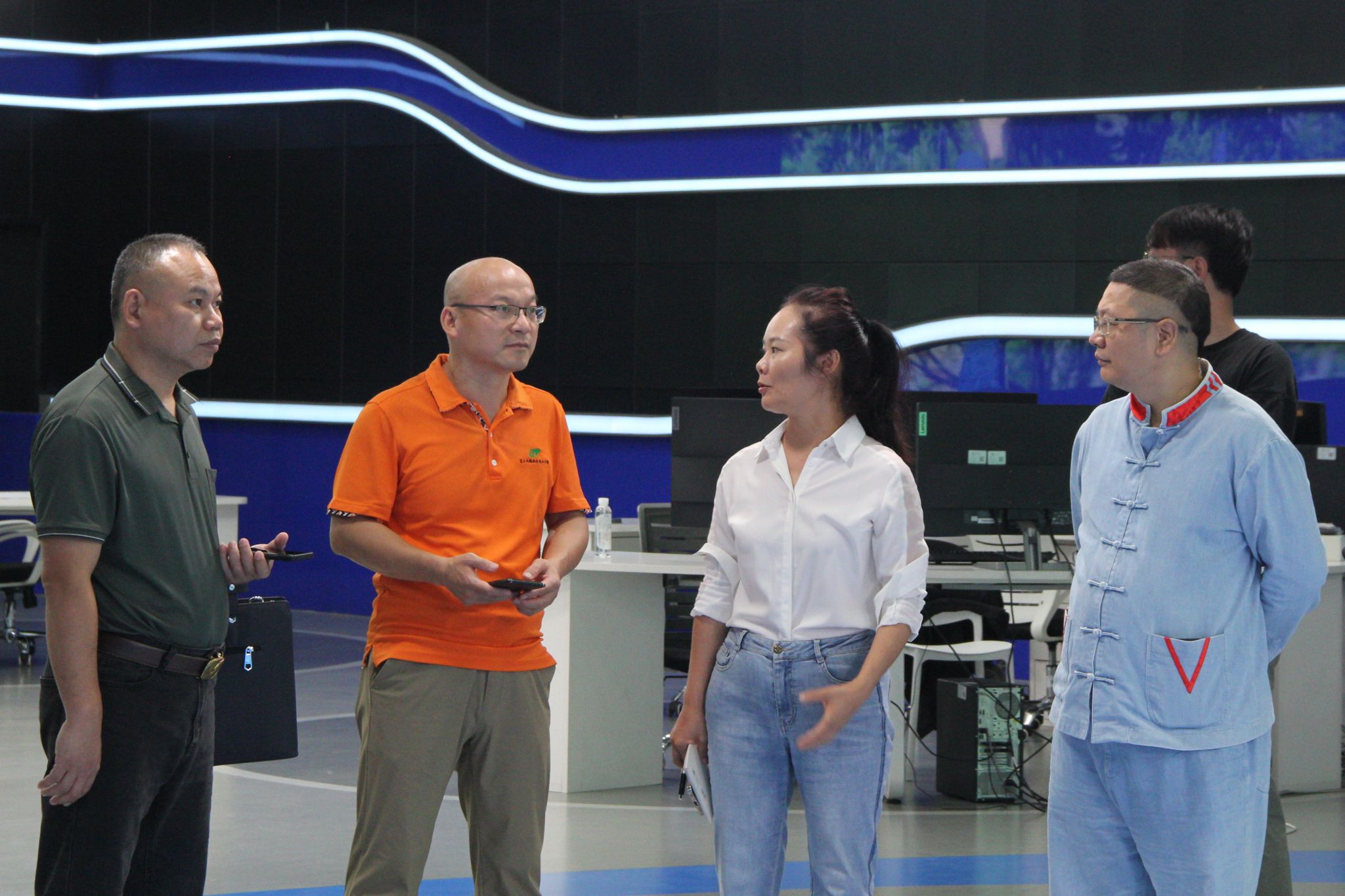 会后,广西人易圣文化有限公司的代表们在党委副书记覃慧敏的带领下参观了我院的融媒体演播实训中心。