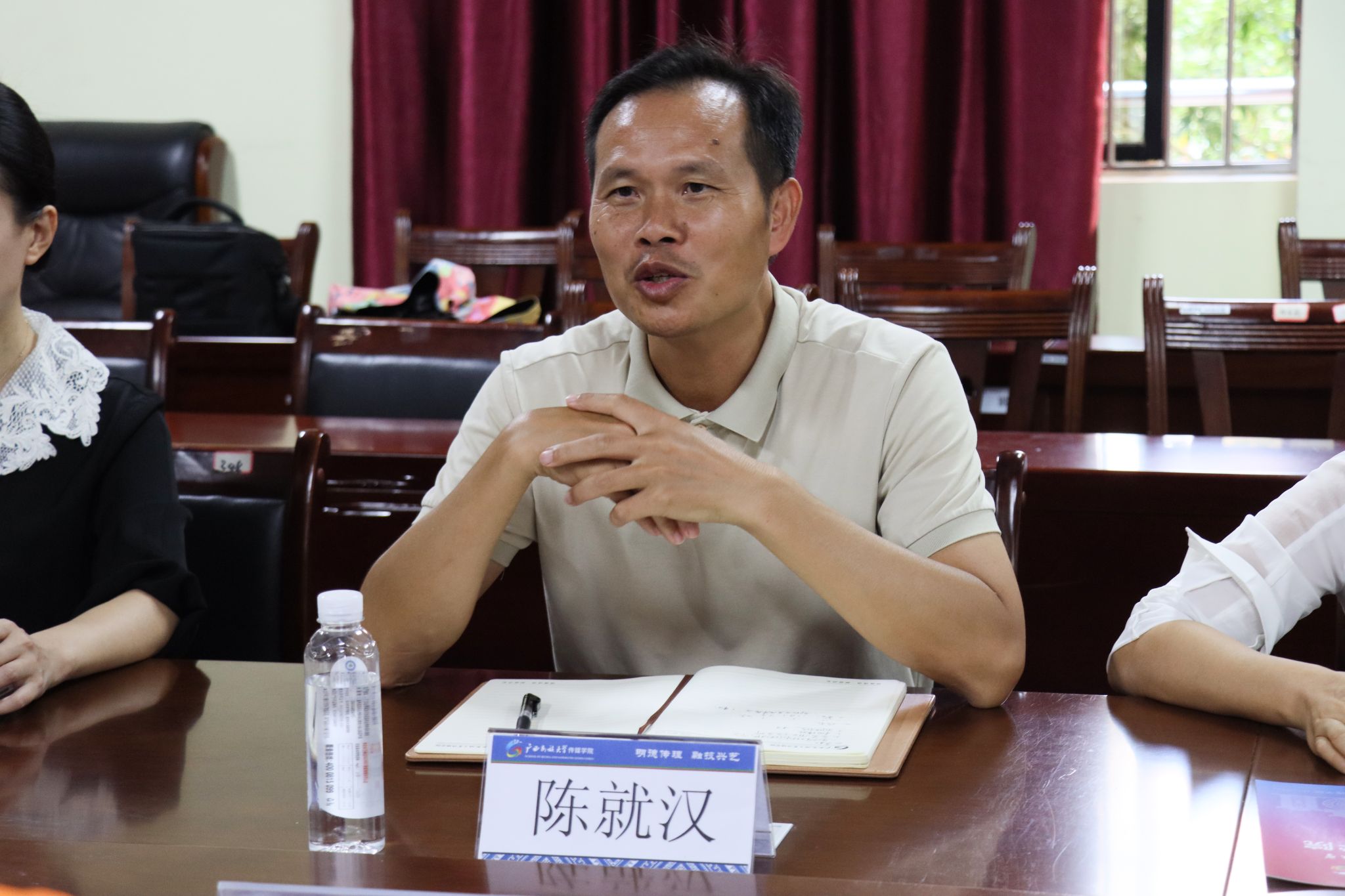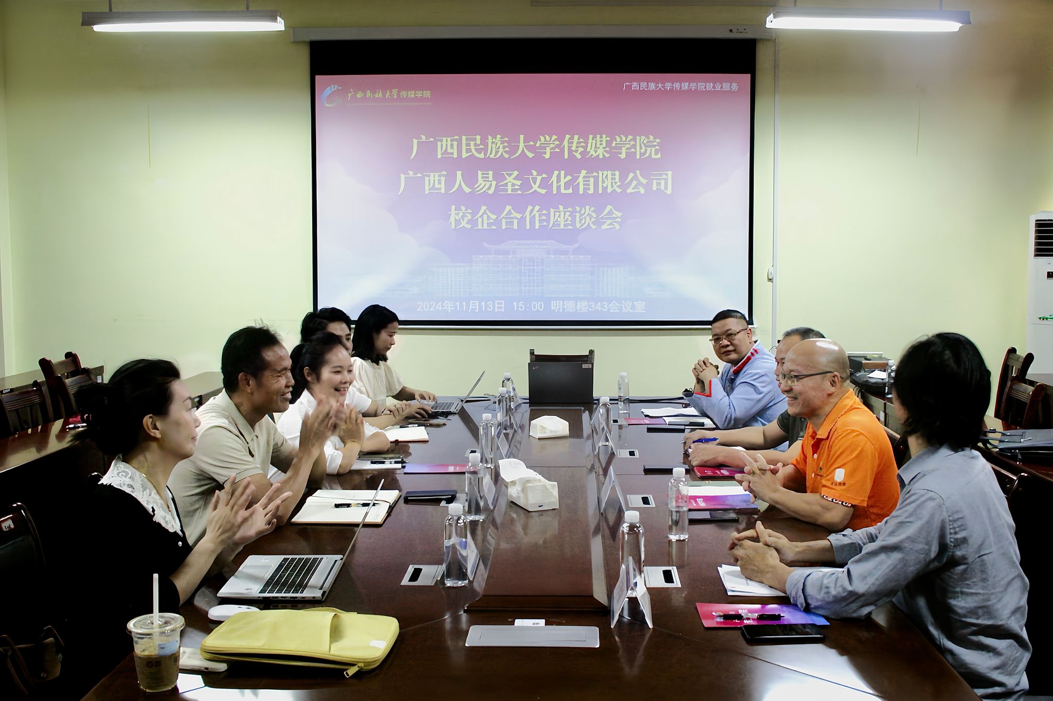 11月13日下午,我院党委书记陈就汉、党委副书记覃慧敏及部分教师代表在明德楼343会议室与广西人易圣文化有限公司董事长韦斌通、总经理李建新等一行四人进行了校企合作座谈会。
