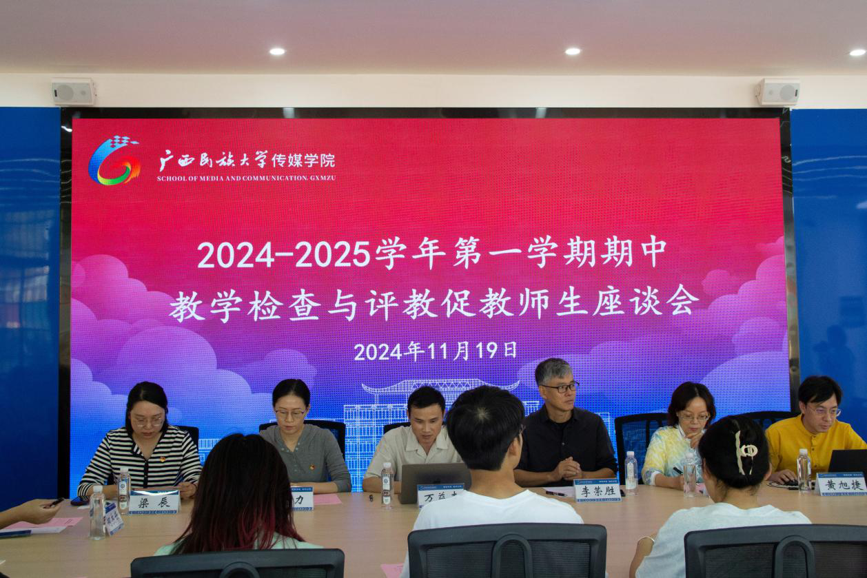 11月19日下午,bw必威西汉姆联2024—2025学年第一学期期中教学检查与评教促教师生座谈会于明德楼一楼大厅举行。学院副院长万益杰、校院两级教学督导及专业教师代表和22名学生代表参加本次座谈会,会议由教学秘书周洛影主持。
