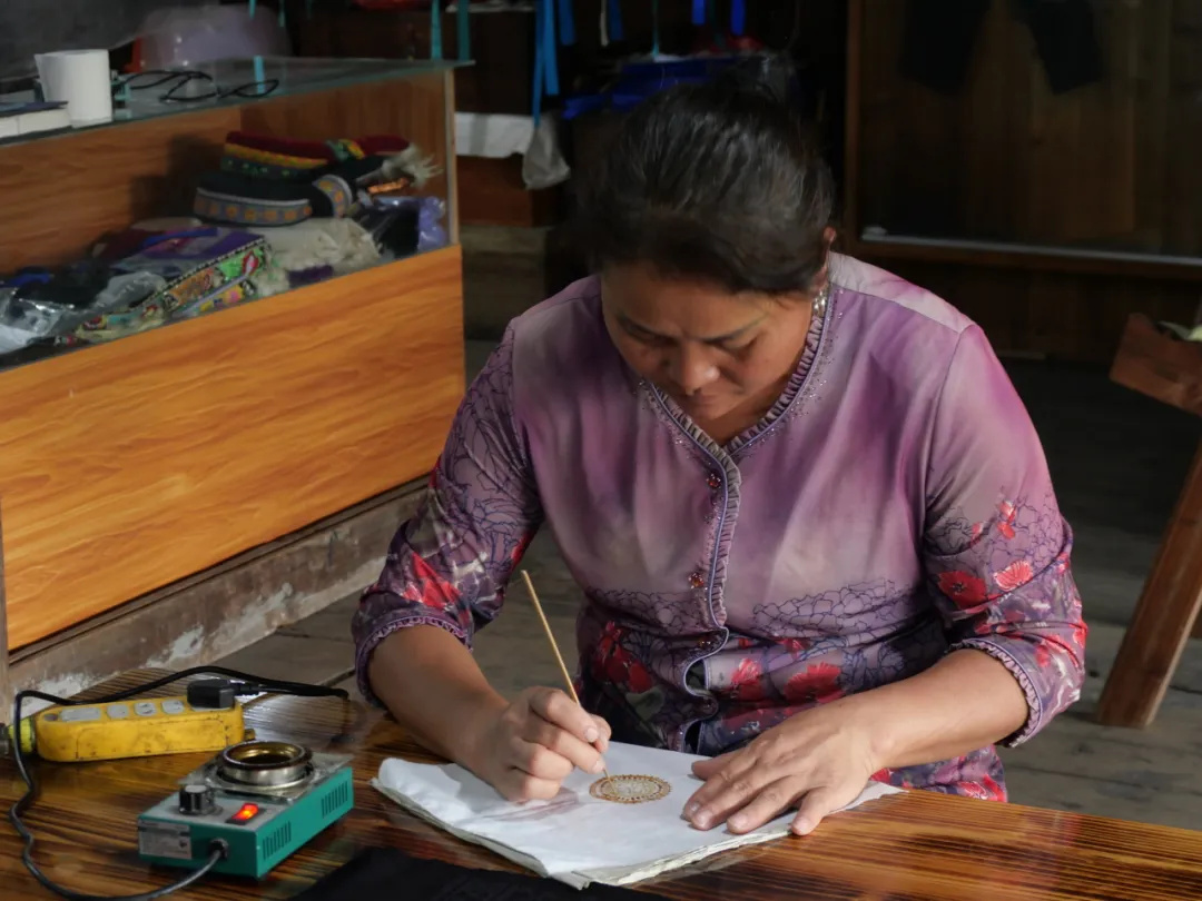 11月17日上午,团队抵达雨卜村蜡染传承基地,与传承人贾霞面对面交流。贾霞在演示蜡染制作工艺的同时,分享了传承这项技艺的挑战及未来发展设想。她表示:“传承需要更多年轻人加入,让蜡染焕发活力。”团队成员通过记录和分析,初步形成了针对蜡染技艺传承的推广建议。