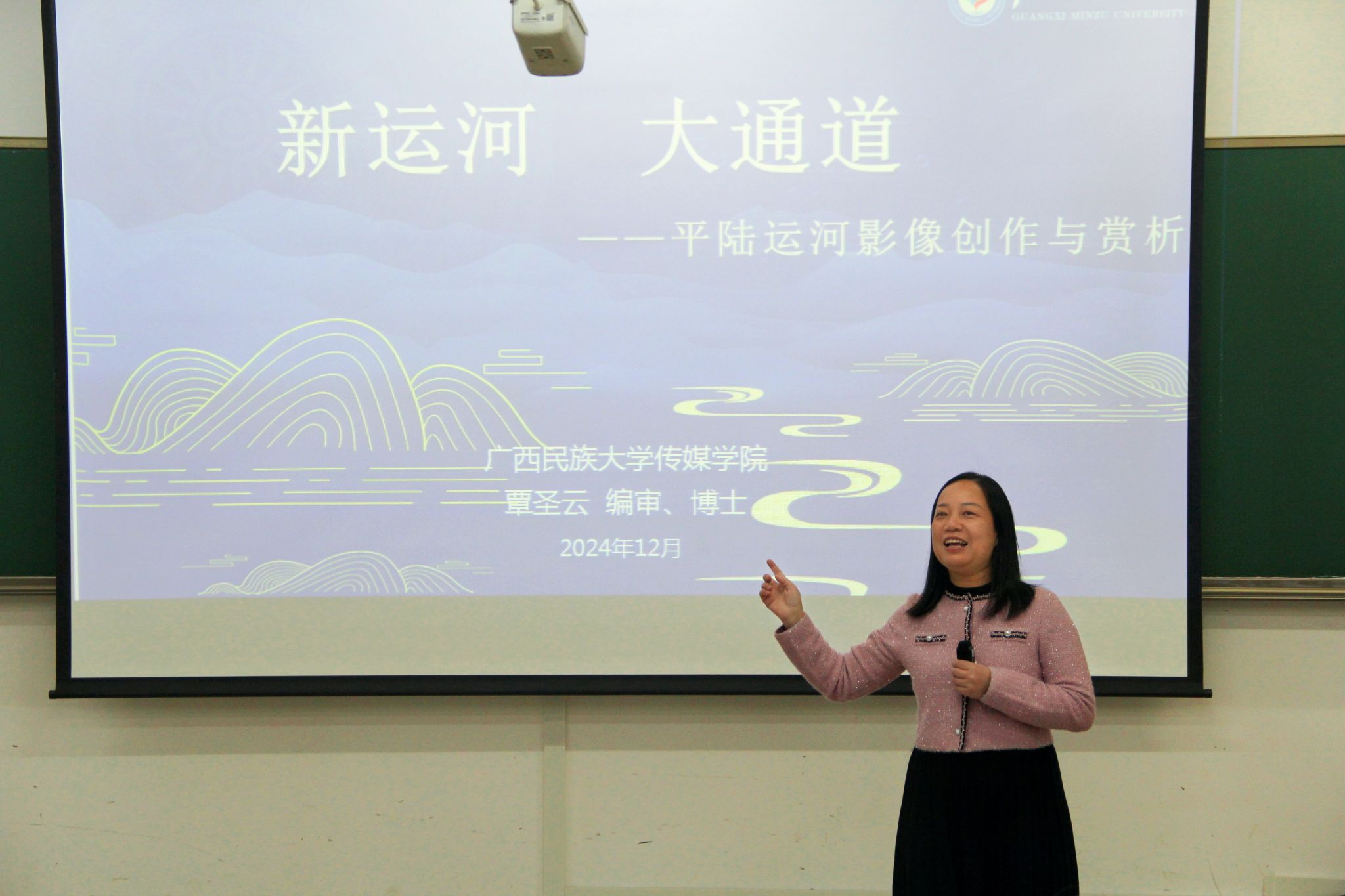 覃圣云表示,广西是一个具有运河历史文化的自治区,并向同学们介绍了广西的潭蓬运河、古桂柳运河、西坑古运河、茂北古运河等,增加同学们对广西运河的了解。最后,她总结到:“影像是一种力量,它能够跨越时空和文化的隔阂。摄影师通过相机和镜头,去捕捉建设者的辛勤劳动、建设过程的变化以及沿线地区的风土人情,留下新时代壮美广西建设进程中一个个珍贵的瞬间。