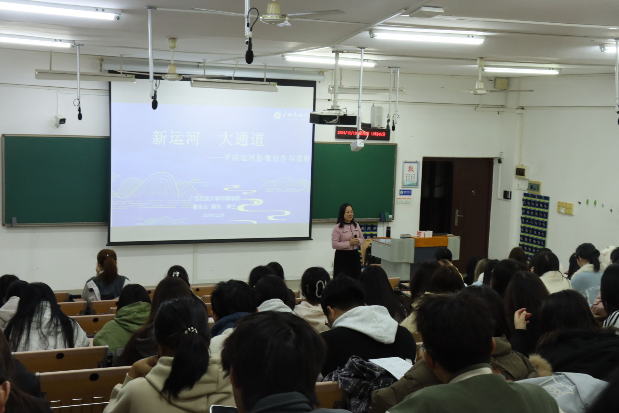 12月19日晚上,广西民族大学bw必威西汉姆联平陆运河影像志研创中心主任覃圣云老师于明德楼312开展平陆运河影像创作与赏析的讲座,2024级新闻学专业学生参加本次讲座。