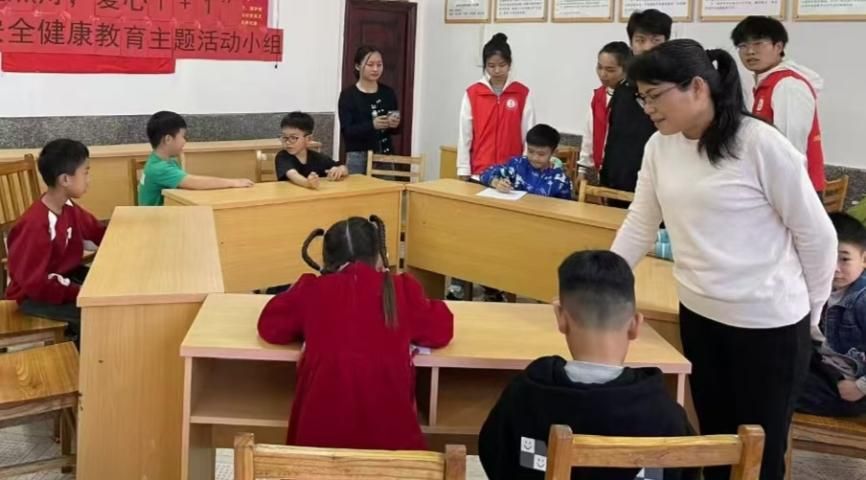 (传院学子罗双燕在安全健康教育教学活动中帮助儿童进行活动签到)