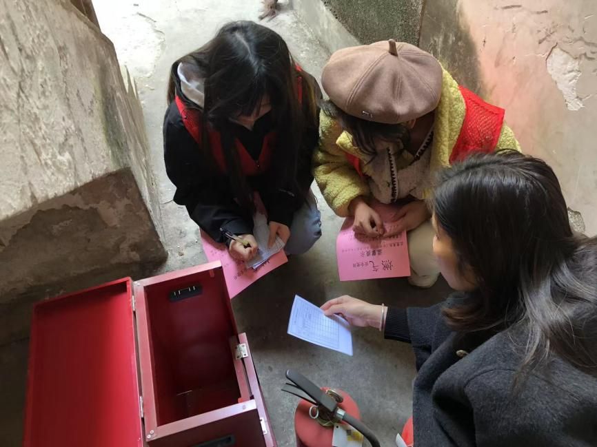传院学子马秋榆(右一)参与检查灭火器安全工作