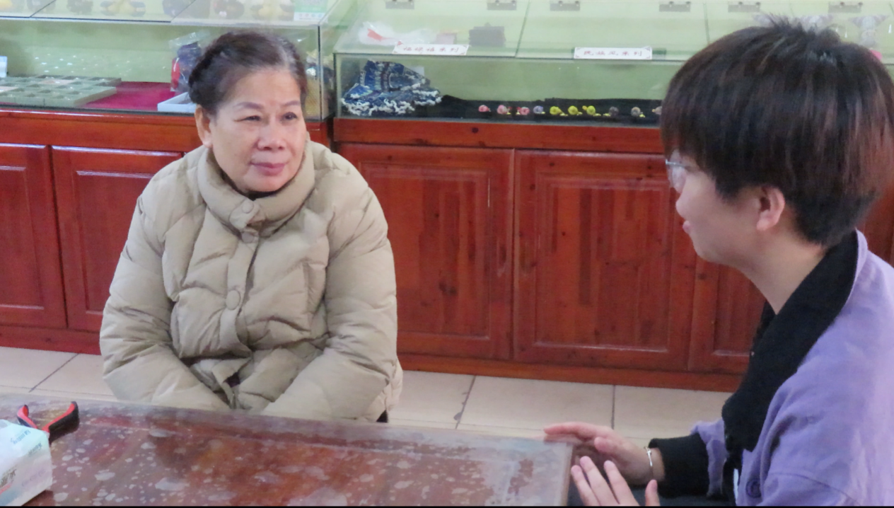 (麽乜制作技艺非遗传承人黄桂珍(左一)向团队介绍麽乜的发展现状,摄影:黄李蜜儿)