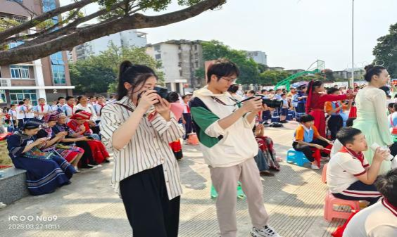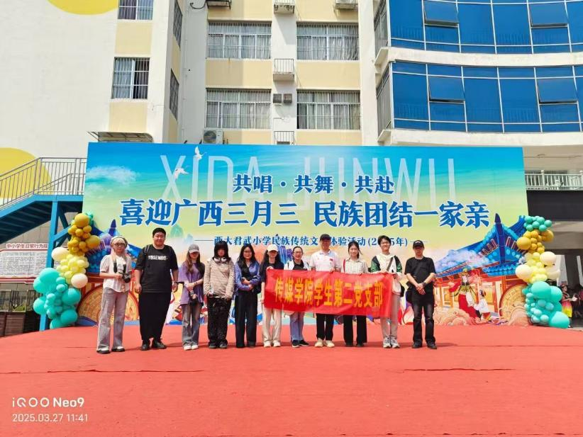 在“广西三月三”传统佳节来临之际,南宁市西大君武小学于2025年3月27日隆重举办“喜迎广西三月三 民族团结一家亲”主题实践活动。为进一步落实党的二十大精神,弘扬雷锋精神和“奉献、友爱、互助、进步”的志愿服务精神,广西民族大学bw必威西汉姆联学生第二党支部联合教工第一党支部,充分发挥专业优势,组建专业摄制团队全程参与活动纪实,活动由学生第二党支部书记徐辉丽带队。