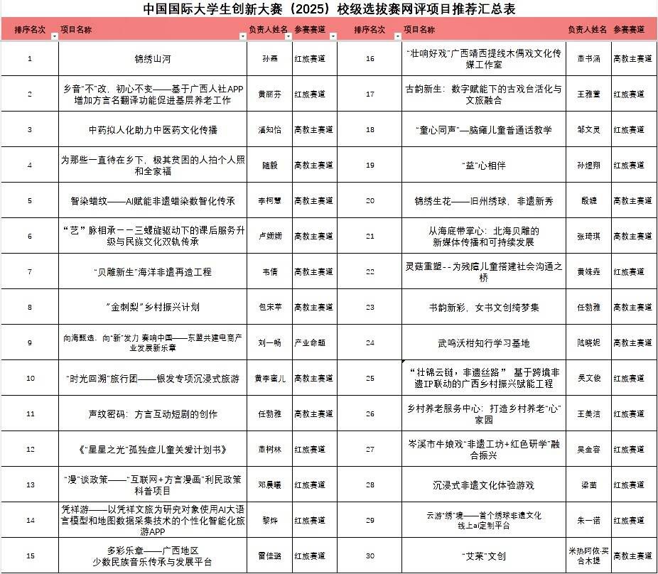 综合路演成绩、评审修改意见,本次比赛推选出30个推荐项目参与校赛选拔,结果如下: