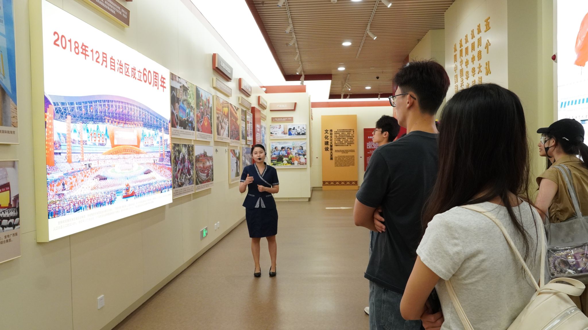 活动中,师生在讲解员的引导下,共同回顾了八桂大地的革命历程和发展成就。教工党员立足传媒专业特色,指导学生从播音主持的职业视角观察展览内容,学习讲解技巧,并鼓励学生主动与讲解员交流互动,深入挖掘历史细节。党员教师结合展陈内容,现场分享自身奋斗经历,以鲜活案例引导学生思考新时代传媒人的责任与担当。