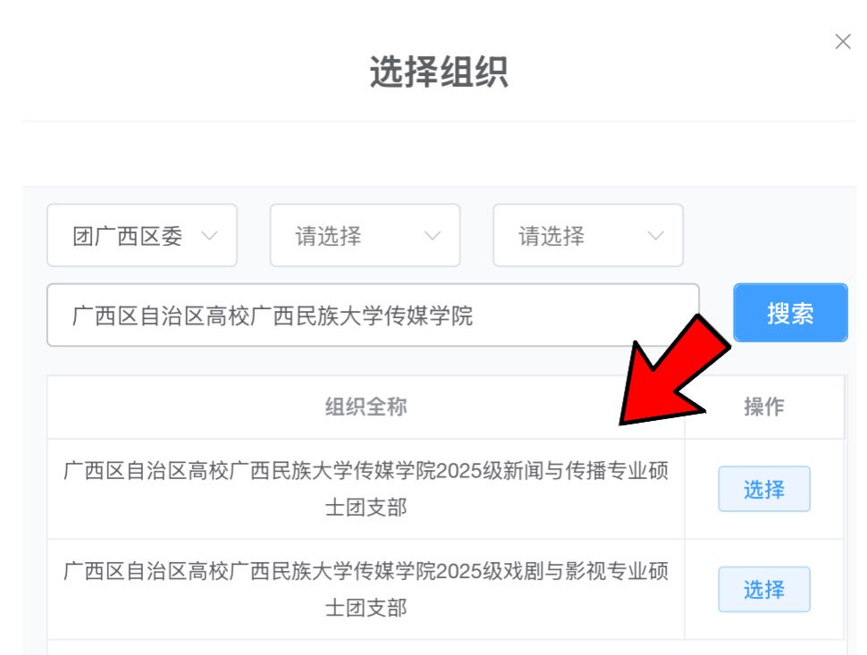 研究生选择“团广西区委”,在搜索栏搜“广西区自治区高校广西民族大学bw必威西汉姆联”,然后选择“2025级相关专业硕士团支部”。