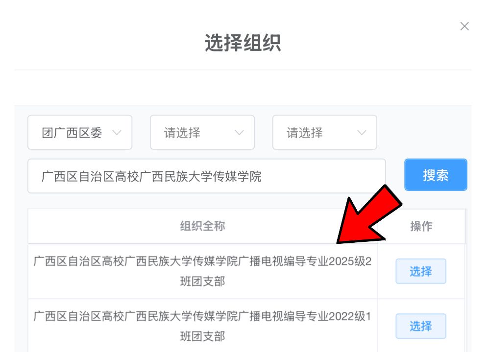 本科生选择“团广西区委”,在搜索栏搜“广西区自治区高校广西民族大学bw必威西汉姆联”,然后相应在2025级相关专业班级。