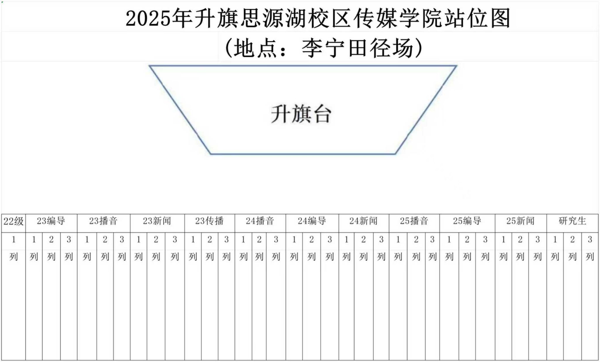 为厚植爱国主义情怀,涵养青年精神底色,进一步营造“礼赞祖国、砥砺初心”的育人氛围,引导传媒学子在红色精神滋养中坚定理想信念、涵养品德修为、践行青春担当,学院特定于2025年10月20日(星期一)举行升国旗仪式。届时,让我们共赴晨光之约,在五星红旗下感悟“国之大者”的深刻内涵,以青春之名续写时代华章,让爱国情、强国志、报国行在校园中蔚然成风。现将有关事宜通知如下: