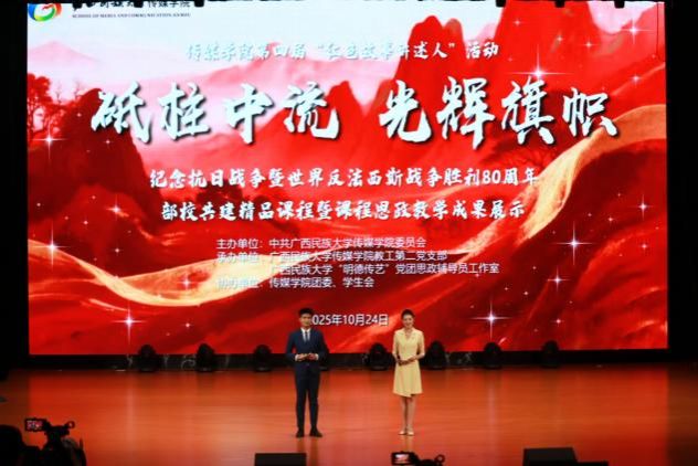10月24日,我院第四届“红色故事讲述人”活动在思源湖校区大学生活动中心隆重举行。本次活动以“砥柱中流 光辉旗帜——纪念抗日战争暨世界反法西斯战争胜利80周年”为主题,我院党委书记黄焕汉、副院长王文娟,学院党委委员、教工第二党支部书记尹力,播音与主持艺术专业负责人、教研室主任黄春平,教工第二党支部副书记、播音与主持艺术专业教师黄旭捷担任本次活动评委,我院600余名师生到场观看。