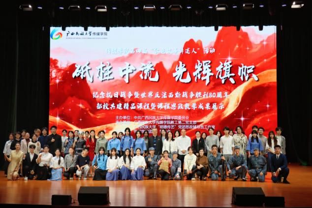 本次活动共33组作品参赛,各作品从不同维度生动演绎历史记忆,以多元视角再现波澜壮阔的抗战画卷,表演者凭借专业创作与深情讲述,多次引发观众集体共鸣。《黄河大合唱》以磅礴气势震撼全场,重现了抗日战争时期中华儿女同心抗敌的壮志图景,更将民族危亡时刻那股不屈不挠、凝聚人心的强大精神力量传递给每一位观众。《红高粱》《迟到半生的家书》等作品,演员们以生动的肢体语言和饱满的情感,刻画出血性的人物形象,展示了中国军民浴血抗敌的壮烈场景;《溶洞里的忠魂》《壮乡烽火谣》《烽火三章·党旗照桂》等作品则深入挖掘广西地区抗战历史,串联起广西民众在党的领导下参与抗战的多个片段。从地下党员传递情报,到普通百姓踊跃参军、支援前线,作品全方位展现了广西地区军民同心、共抗外敌的动人场景,让观众真切感受到八桂大地的抗战激情与红色底蕴。