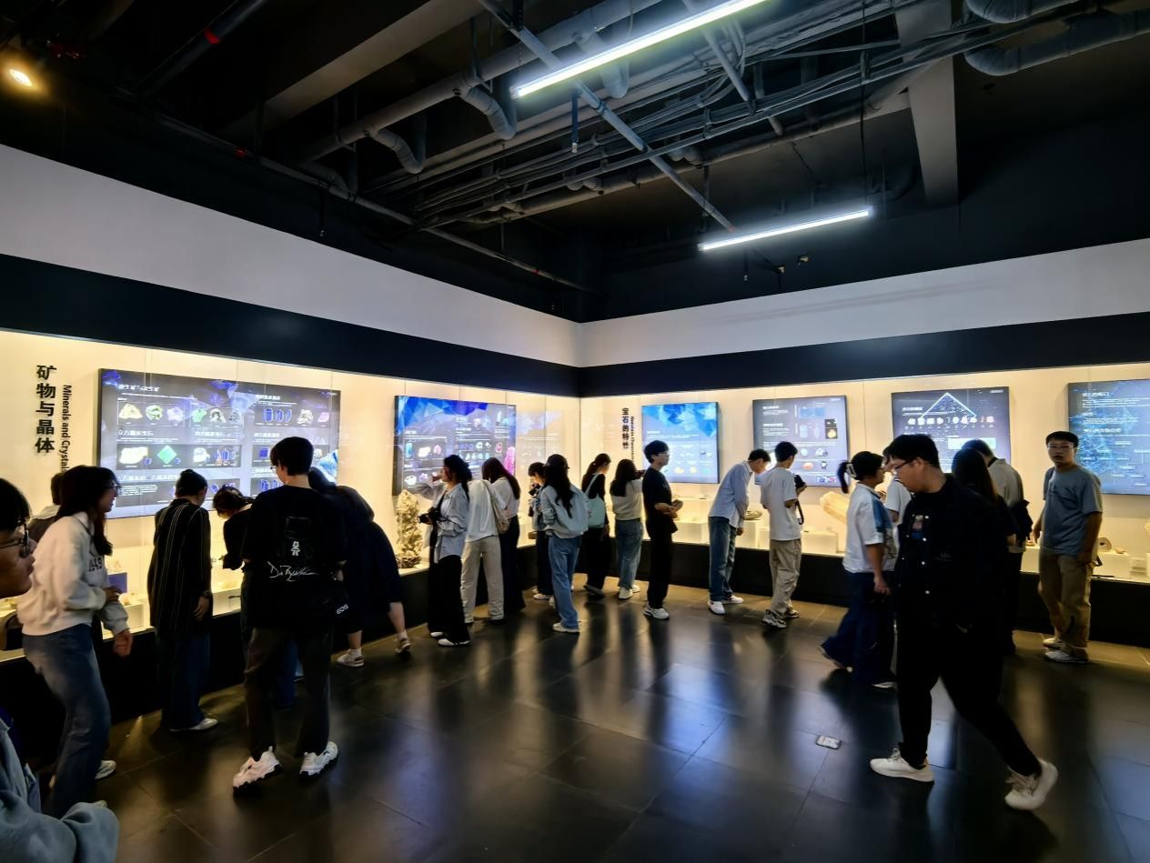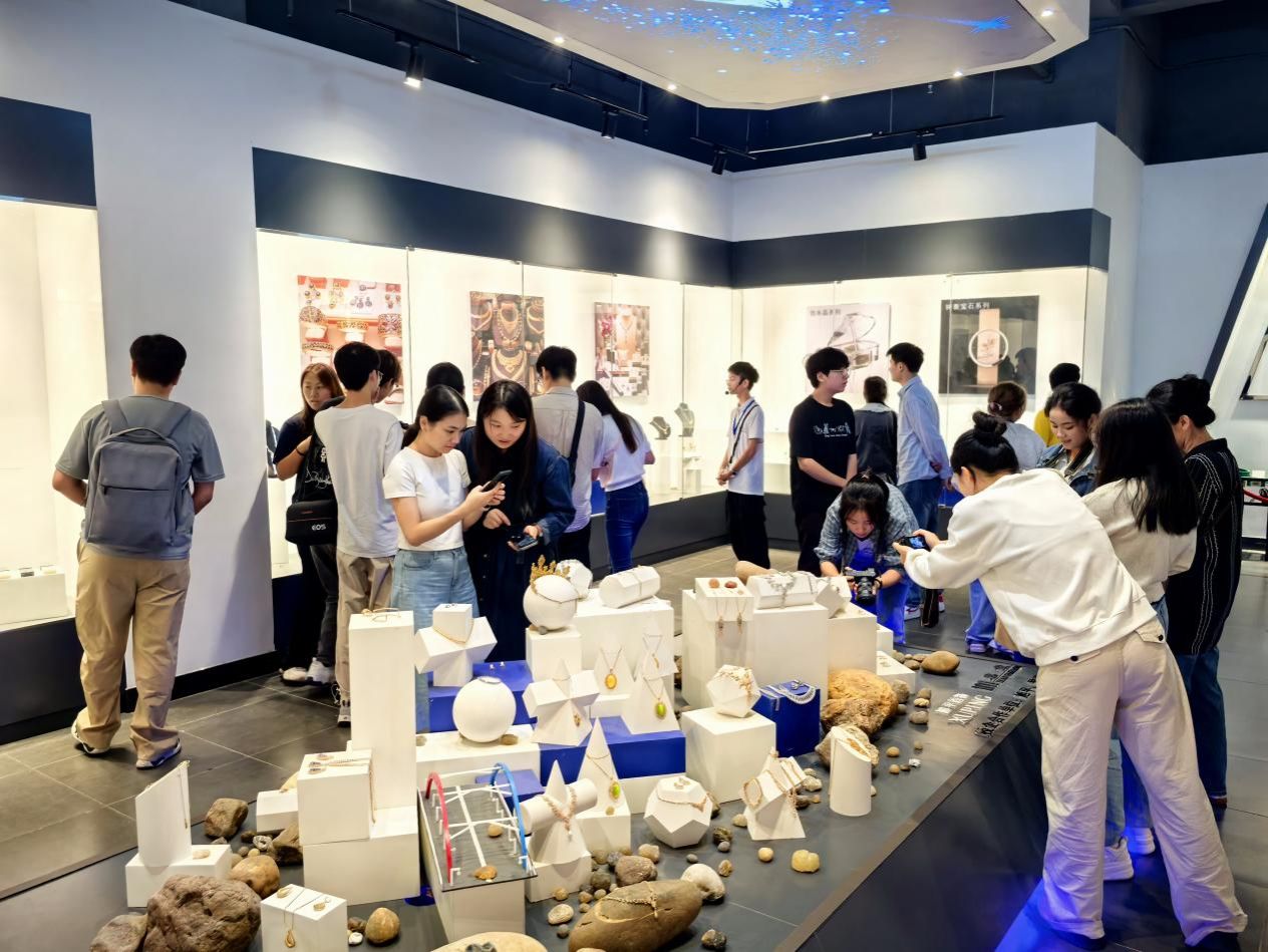 随后,调研团队一行来到梧州学院宝石文化博物馆,调研团队认真观看各类展品,了解宝石加工工艺与文化创意设计理念,为拓展数智传媒教学素材、深化地方特色文化传播研究积累实践经验。在这场深入的调研中,同学们不仅用笔与镜头细致记录创意作品的每一处工艺细节,更与讲解员展开积极互动,在深度交流中沉浸式地探寻设计思路的生成脉络,感受艺术与创意交融的魅力。