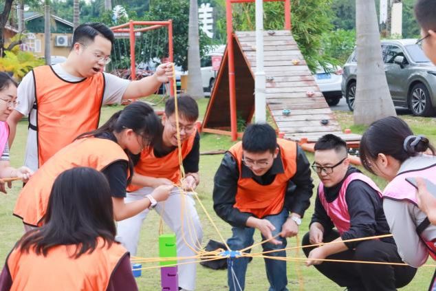 在专业教练的引导下,活动正式拉开帷幕。全体教职工被随机分为三支队伍,各队成员迅速集结,集思广益,确定了独具特色的队伍造型,瞬间点燃了团队斗志。随后的“步步高升”“环球世界”“蒙眼互打”等一系列精心设计的趣味挑战,不仅考验着个人的机智与灵活,更强调了团队的策略与协作。赛场上,老师们全情投入,默契配合;场边,加油声、欢呼声、笑声此起彼伏,与田园风光交织成一幅生动温暖的画卷。整个过程组织有序,气氛热烈而融洽。