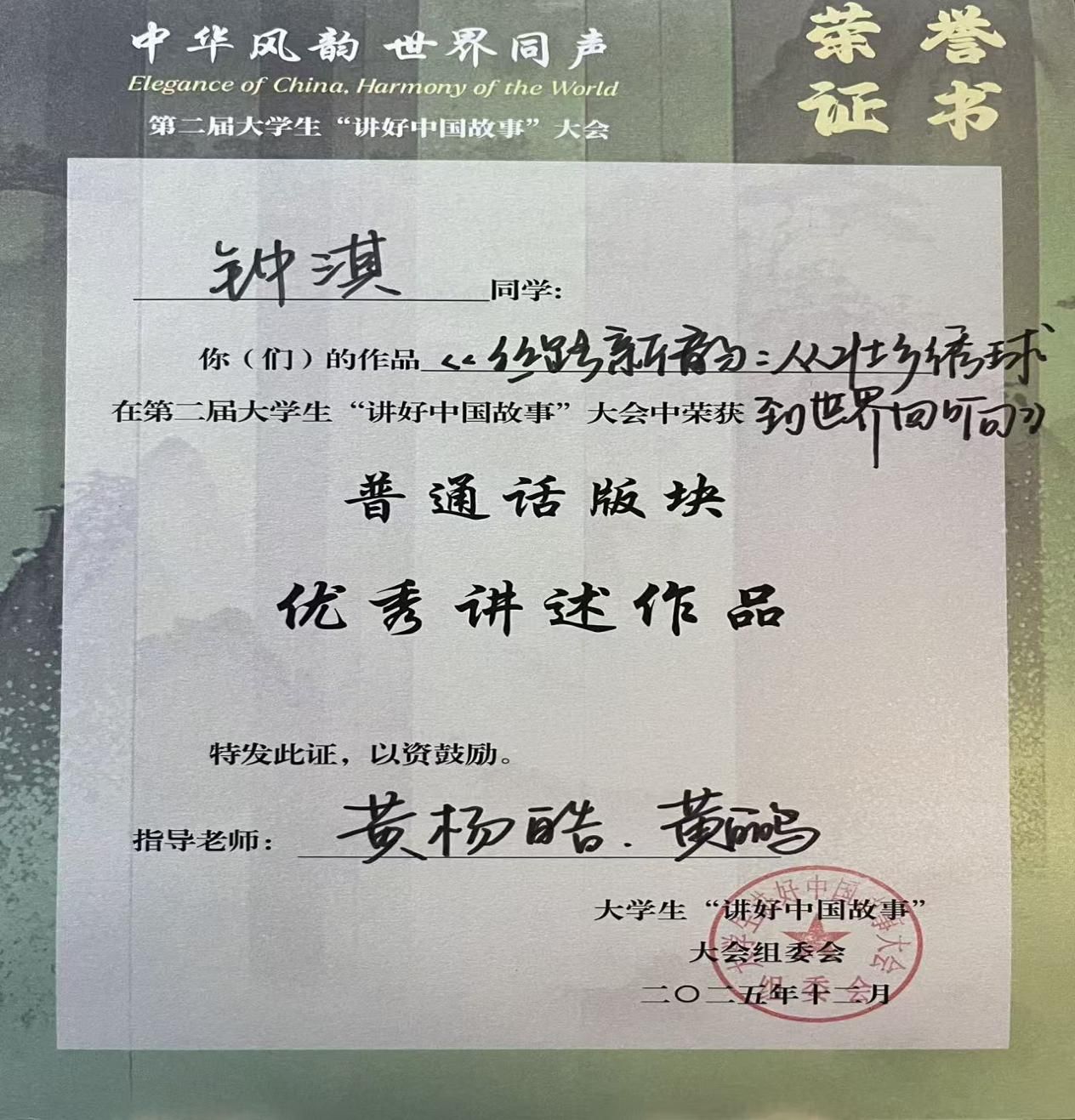 作为聚焦中国故事国际化传播的赛事,大会以挖掘中华优秀传统文化内核、创新叙事传播表达为核心,为青年学子提供了展示文化素养与语言表达能力的舞台。在来自137所高校的1036件参赛作品中,我院学子凭借鲜明的叙事主题、生动的表达形式和真挚的情感传递脱颖而出。黄语晨同学的作品聚焦乡村振兴与文化输出,以“萌马”为载体,讲述了中国乡村文化走向世界的鲜活故事;钟淇同学则以壮族绣球为线索,串联起古丝绸之路与新时代文化交流的脉络,兼具地域特色与国际视野,体现了非遗文化在当代的传承与创新。