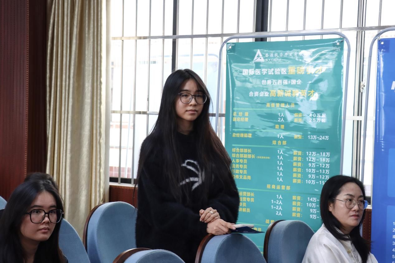 针对学生关注的人才培养与成长路径,唐恬恬重点介绍了“太学士”培养体系,集团围绕“年轻化、知识化、专业化、形象化、国际化”的人才标准,为员工规划基层实践、专业能力培养、管理岗位锻炼三级成长路径。