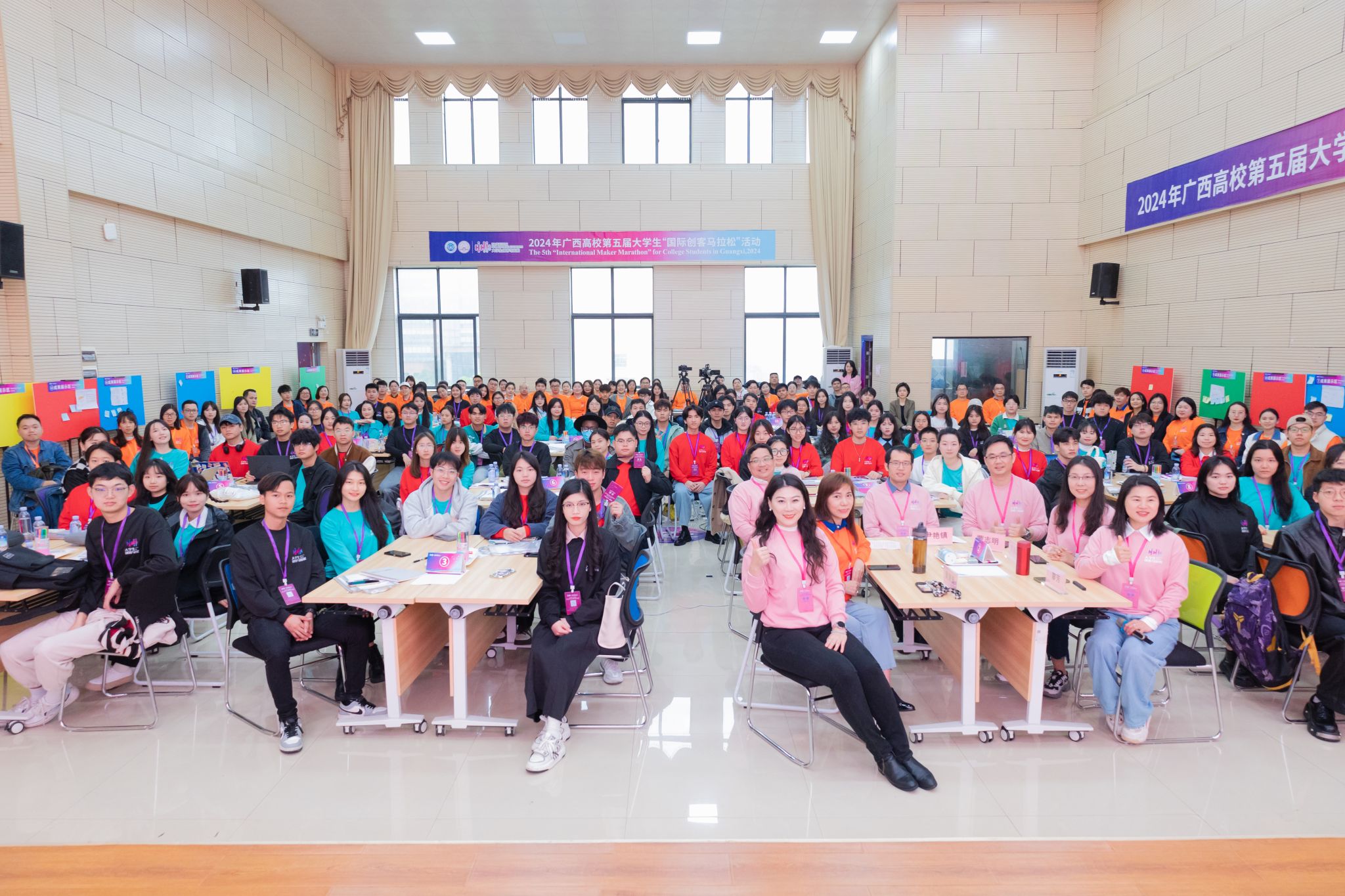 “国际创客马拉松”活动是一场持续32小时的创新与创意挑战,来自广西民族大学、广西大学、广西师范大学、越南雒鸿大学等61所高校,包括泰国、马来西亚、越南、印度尼西亚、老挝、柬埔寨、刚果民主共和国、缅甸等国家的21名留学生在内的161名师生共同见证了这场集创新、激情与智慧于一体的青年创客盛宴。创客们跨校跨专业组建15支队伍,在紧张而富有激情的氛围中展开了一场场激烈的思维碰撞与创新实践。活动现场,学生们围绕三个项目课题展开深入探讨,在团队协作、创意设计、技术实现等环节,不断挑战自我,追求卓越。
