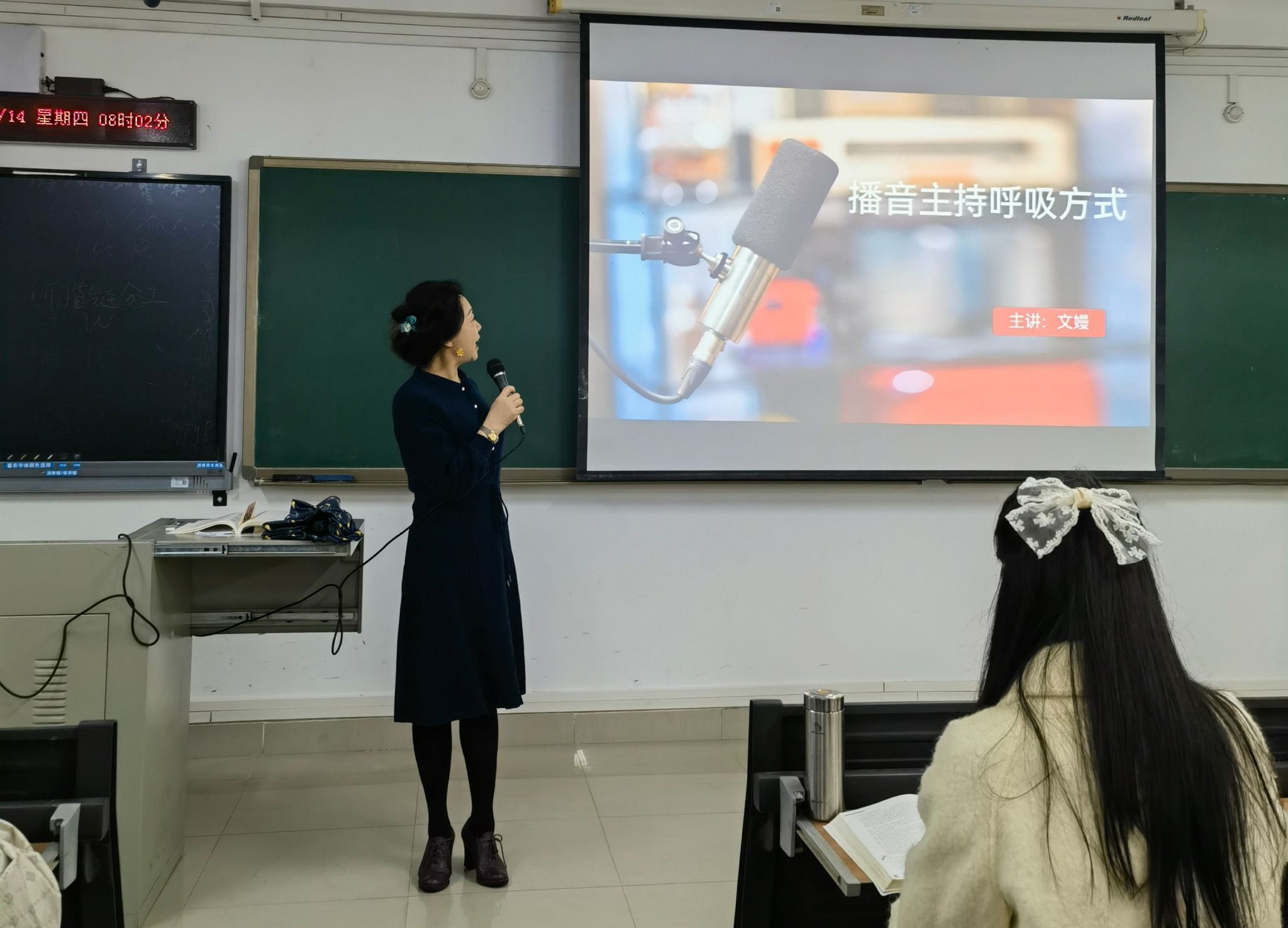 本次公开课由教工第二党支部播音与主持艺术教研室文嫚老师主讲,授课内容为校级一流线下课程《普通话语音与播音发声Ⅱ》的《播音主持呼吸方式》。文嫚老师以生动的语言,图文并茂地介绍了呼吸方式在播音主持中的基本原理和运用技巧,并结合实例指出了播音主持中常见的呼吸问题,详细讲解了不同呼吸方式的特点和适用场景。同时,她还通过《新闻联播》《朗读者》《2023中央广播电视总台主持人大赛》等短视频巧妙地将思政元素融入教学中,引导学生们思考如何在播音主持实践中践行社会主义核心价值观,传递中国声音,讲好中国故事。