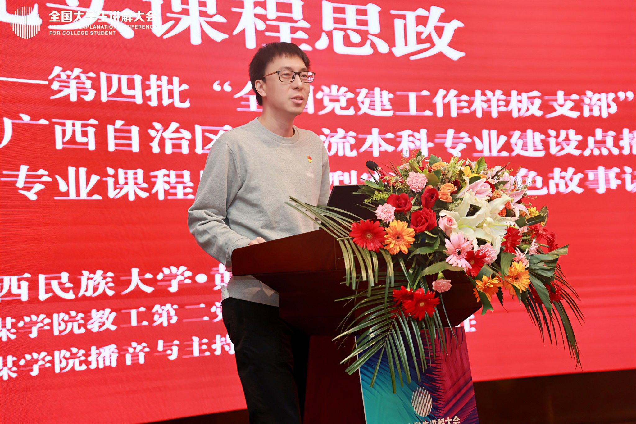 黄旭捷以《推动党建引领 讲述红色故事 充实课程思政——第四批“全国党建工作样板支部”培育创建暨广西自治区级一流本科专业建设点播音与主持艺术专业课程思政典型案例:红色故事讲述人活动》为题,分享“红色故事讲述人”活动经验。他表示,挖掘、宣传和利用红色资源是深植新文科改革,创新课程思政建设的重要途径之一。推进新时代播音与主持艺术专业教学改革,必须注重内涵建设,因地制宜,要充分挖掘广西红色资源,凝练红色故事,建构讲好红色故事的载体,凝心聚力,增强文化辐射力集聚力。