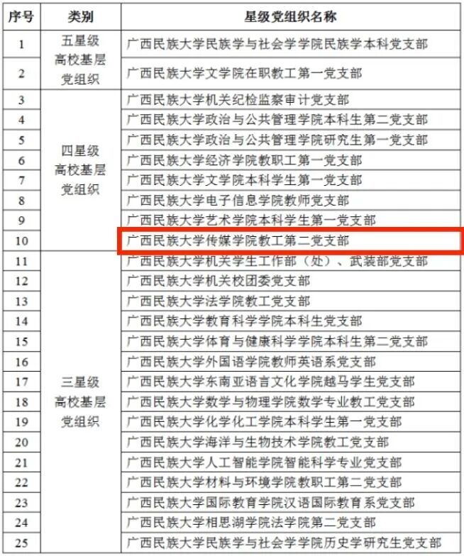 近日,自治区党委教育工委、自治区党委组织部下发了《中共广西壮族自治区委员会教育工作委员会中共广西壮族自治区委员会组织部关于命名星级高校基层党组织的决定》(桂工委组〔2024〕14号)通知,我院教工第二党支部被命名为四星级党组织。