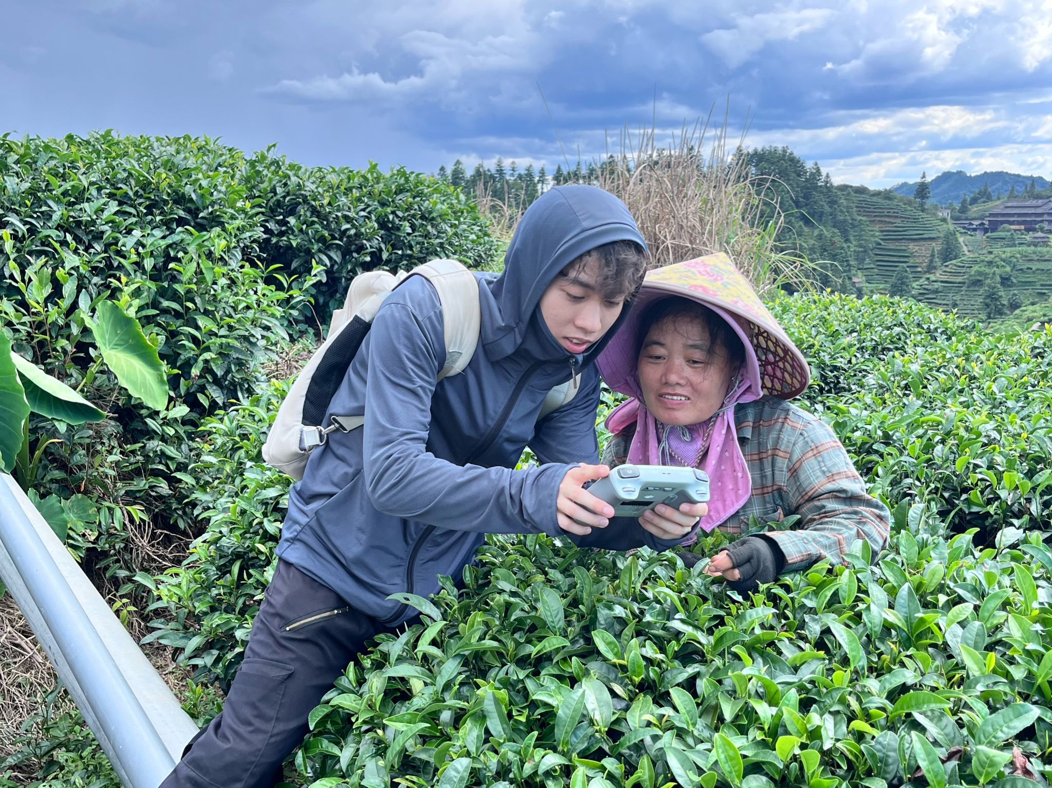 实践期间,小分队还登上了环绕山寨的茶山,用摄影设备记录下茶山与云海交融时那如诗如画的美妙场景。高友村作为三江早春茶的产地,其茶叶产业是“绿水青山就是金山银山”发展理念的生动写照。小分队通过采访正在采茶的村民,认真学习茶叶的采摘技巧,从起初的生疏到逐渐熟练,寻芽、采取、入篓,每个动作都饱含着对这片土地的敬意。