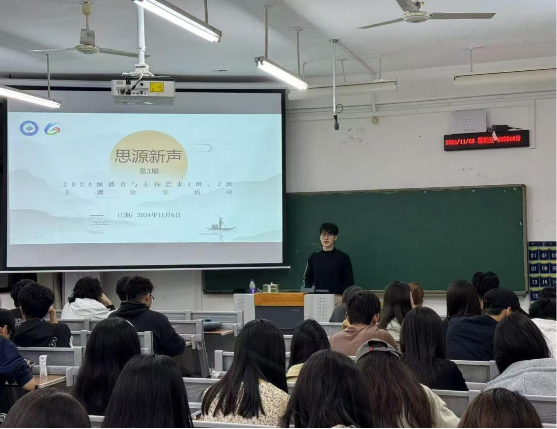11月6日晚,我院2024级播音与主持艺术专业在明德楼315教室成功举办了第三期“思源新声”主题经验分享会。本次活动由播音与主持艺术专业负责人、2024级班主任黄春平老师主持,教工第二党支部副书记、播音与主持艺术专业教研室主任黄旭捷主讲,同时邀请了2021级播音与主持艺术专业学生莫平凡进行经验分享。
