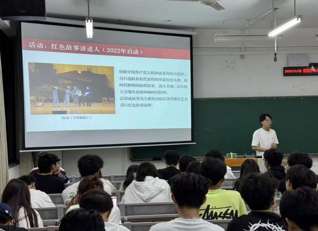黄旭捷首先向同学们详细介绍了前两届“红色故事讲述人”活动的开展情况,并着重强调了党建引领在活动中的核心作用。他提到,即将开启的第三届“红色故事讲述人”活动将紧密围绕中国共产党人精神谱系(第一批)进行选题,鼓励同学们深入挖掘和展现广西本土红色故事。同时,他还向同学们阐述了“深入理解——具体感受——形之于声——及于受众”的创作过程,强调要树立精品意识,加强团队合作,注重在“共知”“共情”“共鸣”“共行”等方面下功夫,实现以知促行、知行合一的目标。