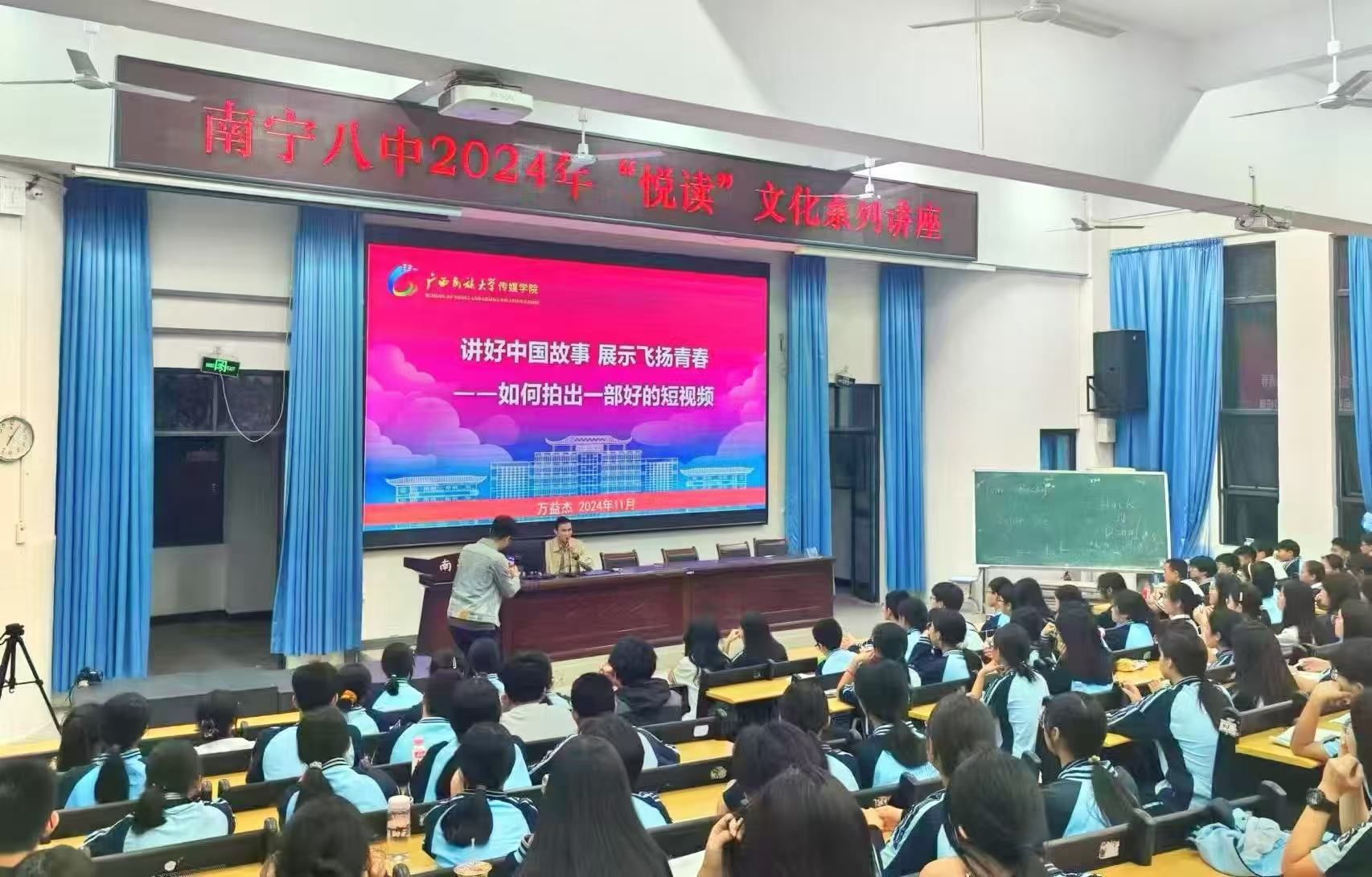 为深化党建共建工作,促进中学美育建设,11月22日,我院副院长、教工第二党支部成员万益杰受邀前往南宁市第八中学,为师生带来了一场题为“讲好中国故事,展示飞扬青春——如何拍出一部好的短视频”的精彩讲座。